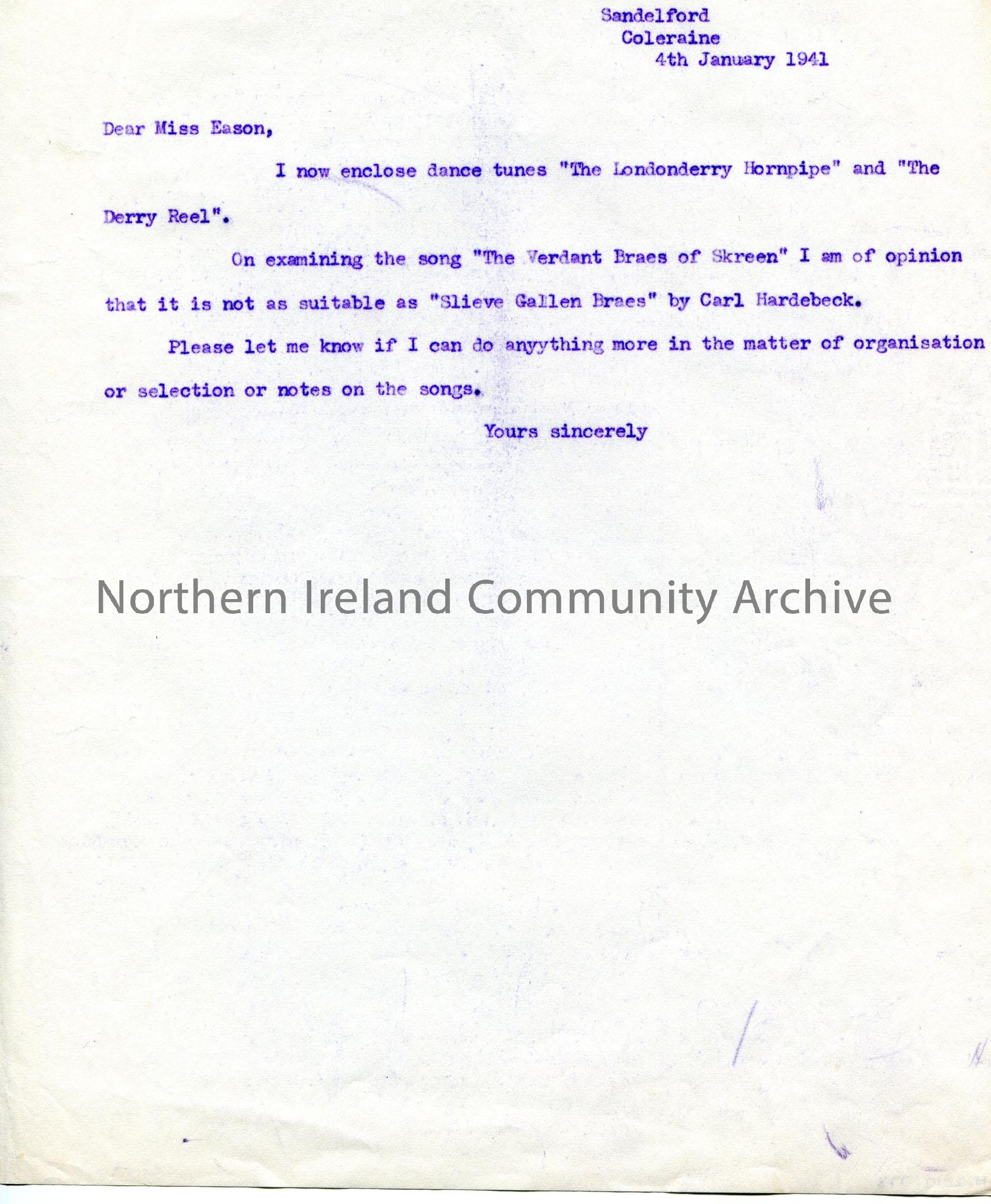 Carbon copy of a letter to Miss Ursula Eason of the BBC. Writing re broadcast 'Music of Derry.' Encloses tunes 'The Londonderry Hornpipe' and 'The Derry Reel.' The song 'The Verdant Braes of Skreen' is not suitable.