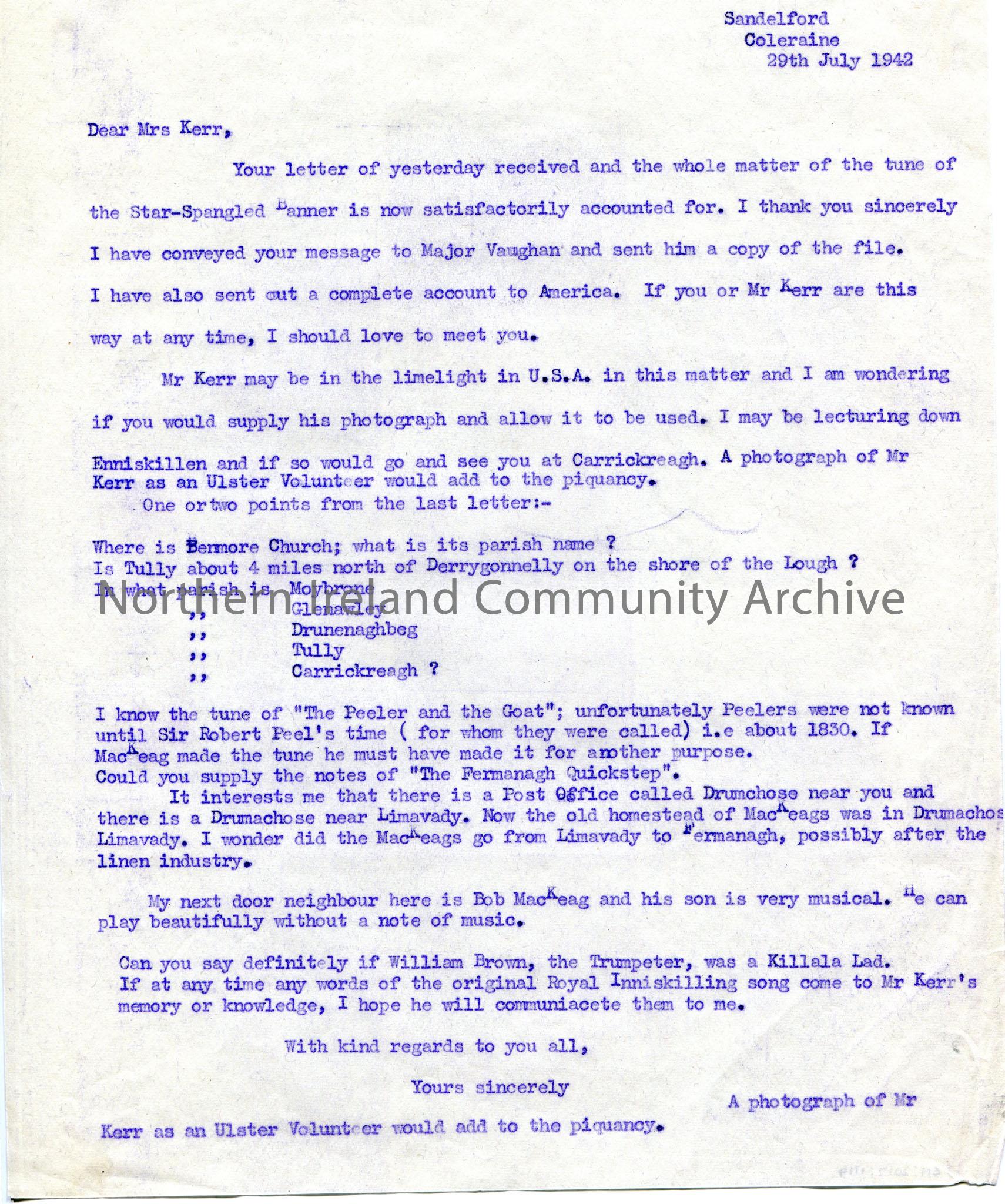Carbon copy of a letter to Mrs Kerr. Writing re the song 'The Star Spangled Banner'. Has sent a copy of his findings to Major Vaughan and America. Would like a photograph of Mr Kerr as an Ulster Volunteer for publication. Sam to lecture in Enniskillen and would like to meet Mr Kerr at Carrickreagh. Also mentions Benmore Church, Tully, Derrygonnelly, Moybrone, Glenawley, Drunenaghbeg, Drumchose, Drumachose, Limavady, Killala and the family name MacKeag. Mentions William Brown, Trumpeter in the Royal Inniskillings. Mentions songs 'The Peeler and the Goat' and 'The Fermanagh Quickstep'.