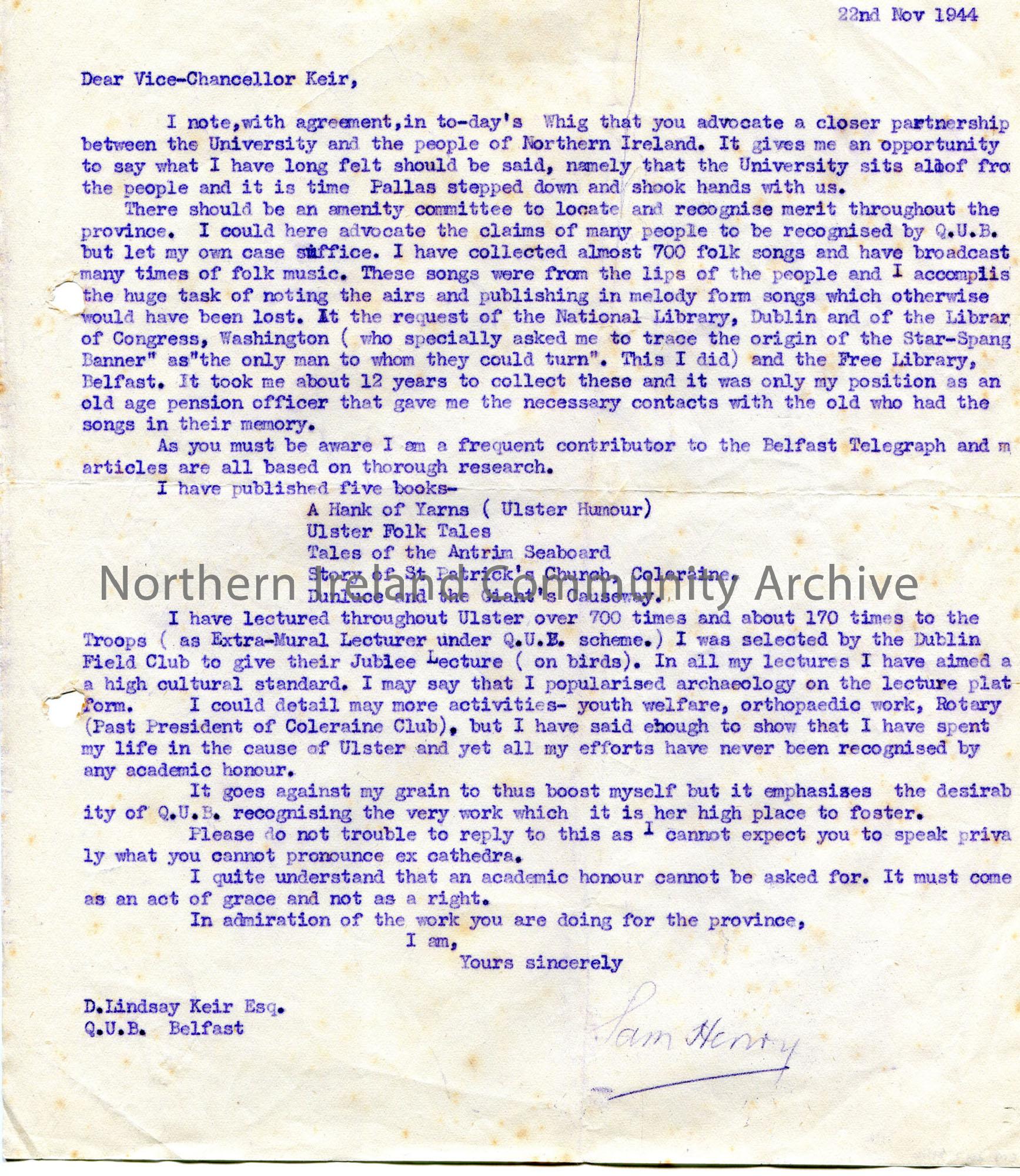 Carbon copy of a typed letter, signed, to Vice-Chancellor D. Lindsay Keir, QUB [Queens University] Belfast. Sam calls for a 'closer partnership' between the University and 'the people of Northern Ireland'. He gives an overview of his work, as contribute to the Belfast Telegraph, 5 books which he has published, time spent lecturing and other activities.