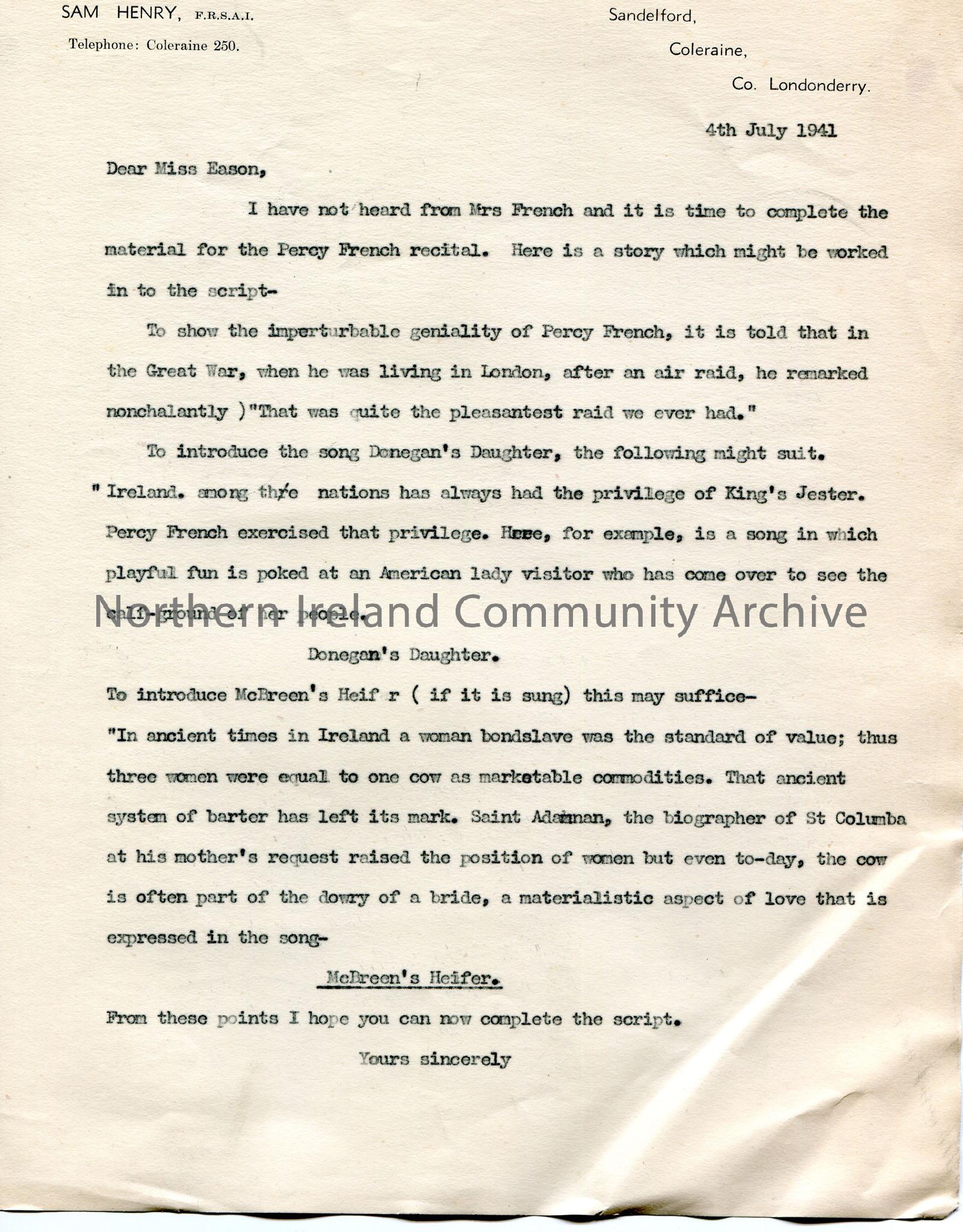 Carbon copy of a typed letter to Miss Ursula Eason. Writes that Percy French's widow did not reply to Sam for material for the Percy French broadcast. Makes suggestions for the script.