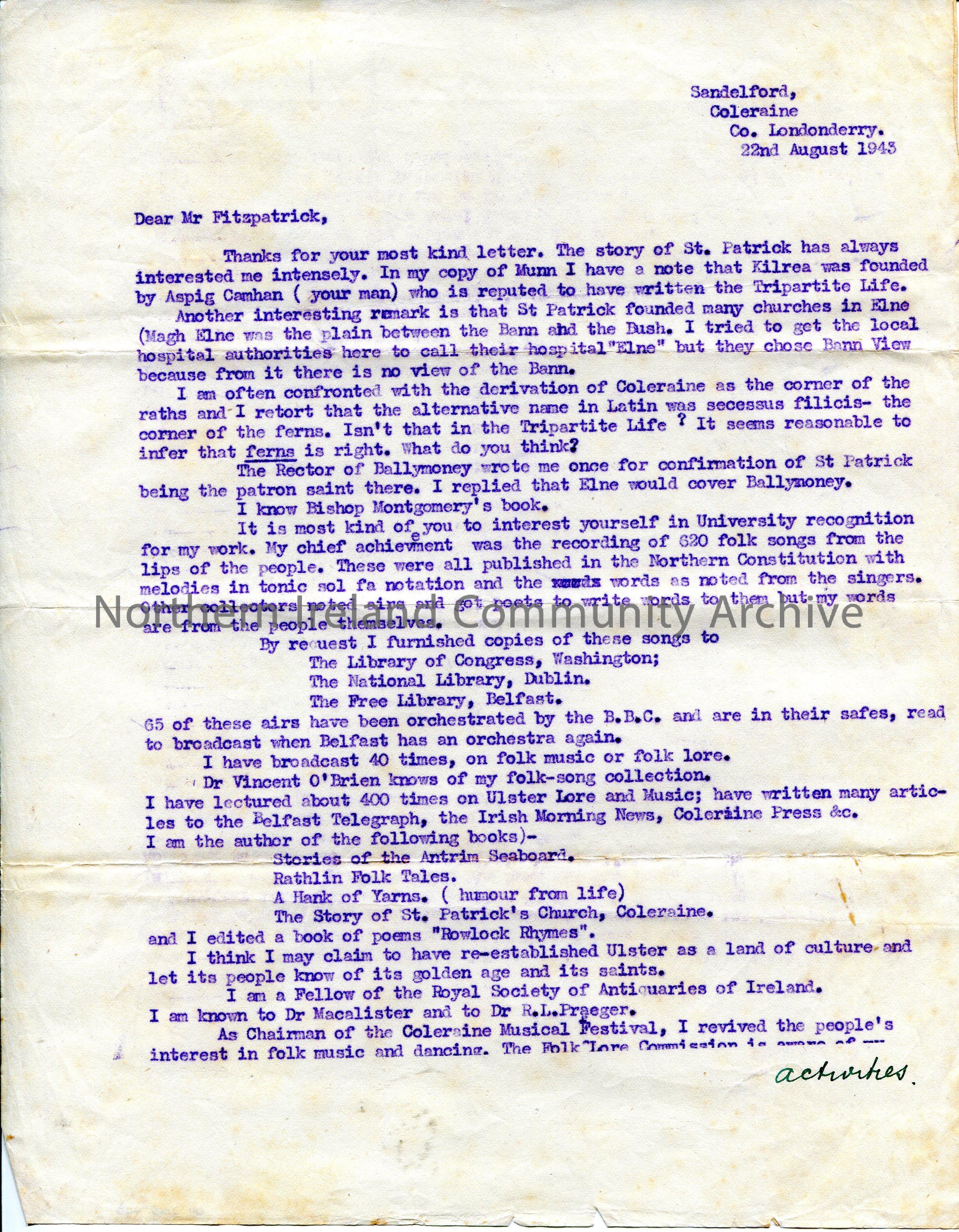 Carbon copy of a typed letter to Mr [Bryan] Fitzpatrick from Sam Henry. Writing re St. Patrick. Sam lists his achievements to date to help to get University recognition of his work from the National University of Ireland.