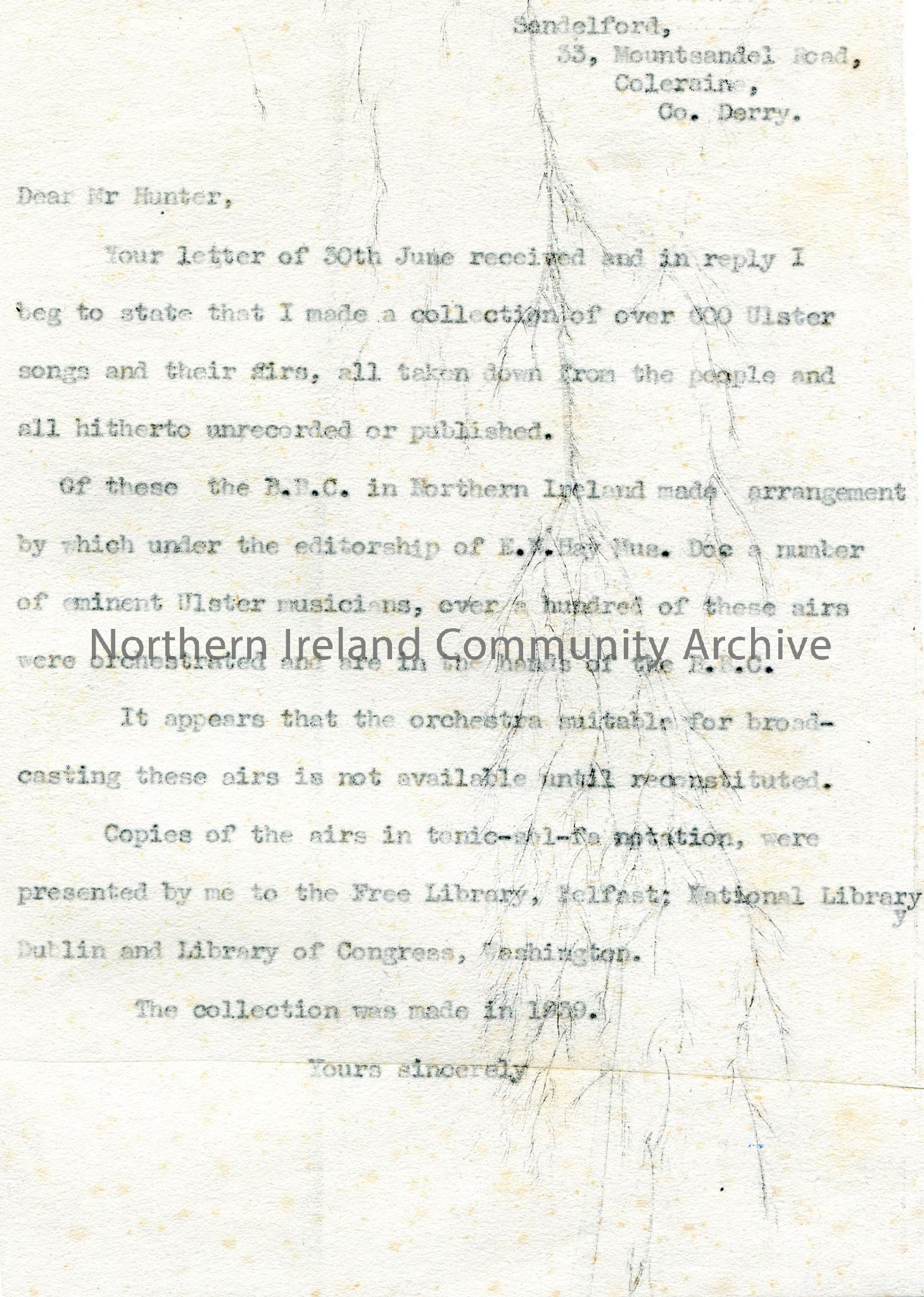 Carbon copy of a typed letter to Mr Hunter. Sam notes that he has collected over 600 Ulster songs and their airs. More than 100 have been orchestrated…
