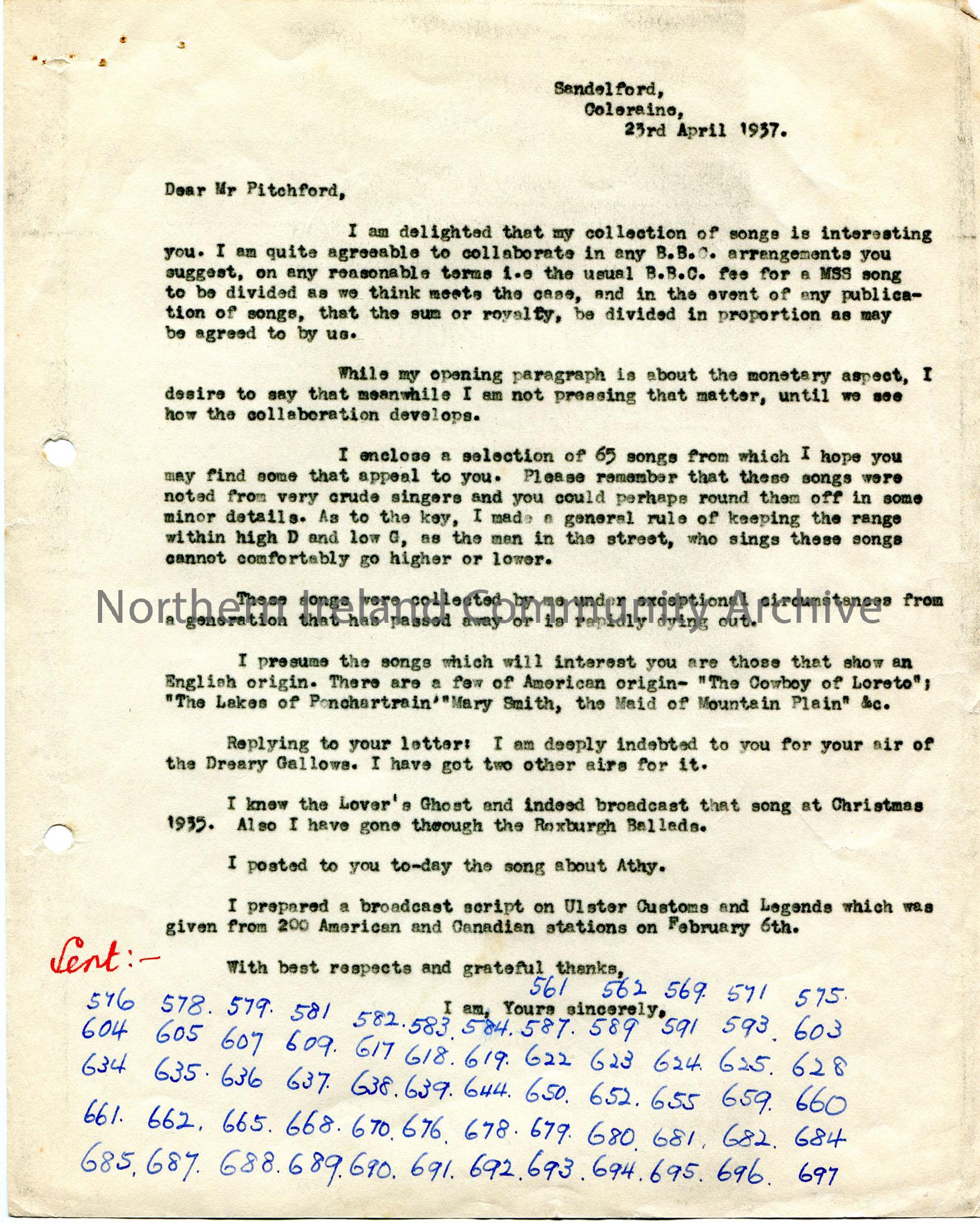 Carbon copy of a typed letter to Mr Pitchford. Writing re folk songs. Happy to collaborate with him for the BBC. Discusses fees. Encloses selection of 65 songs. Handwritten list of numbers of the songs at bottom of letter in ink. Thanks Mr Pitchford for the air of 'Dreary Gallows'. Sam's script on Ulster Customs and Legends was given from 200 American and Canadian stations on 6th February.
