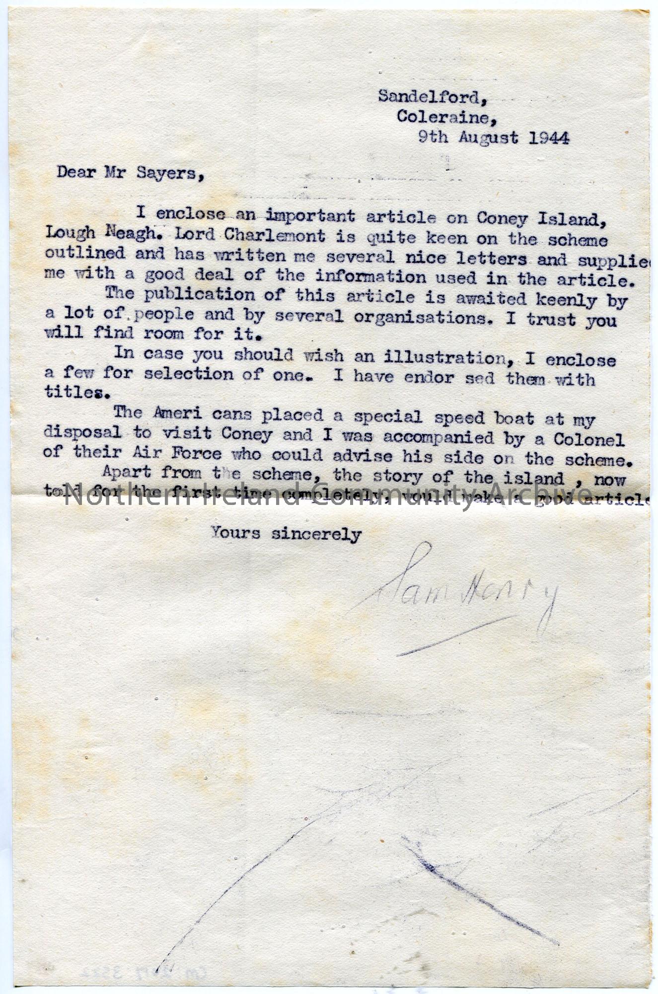 Carbon copy of a typed letter to Mr Sayers. Sam is currently writing an article on Coney Island. Encloses article and asks if illustrations are requir…