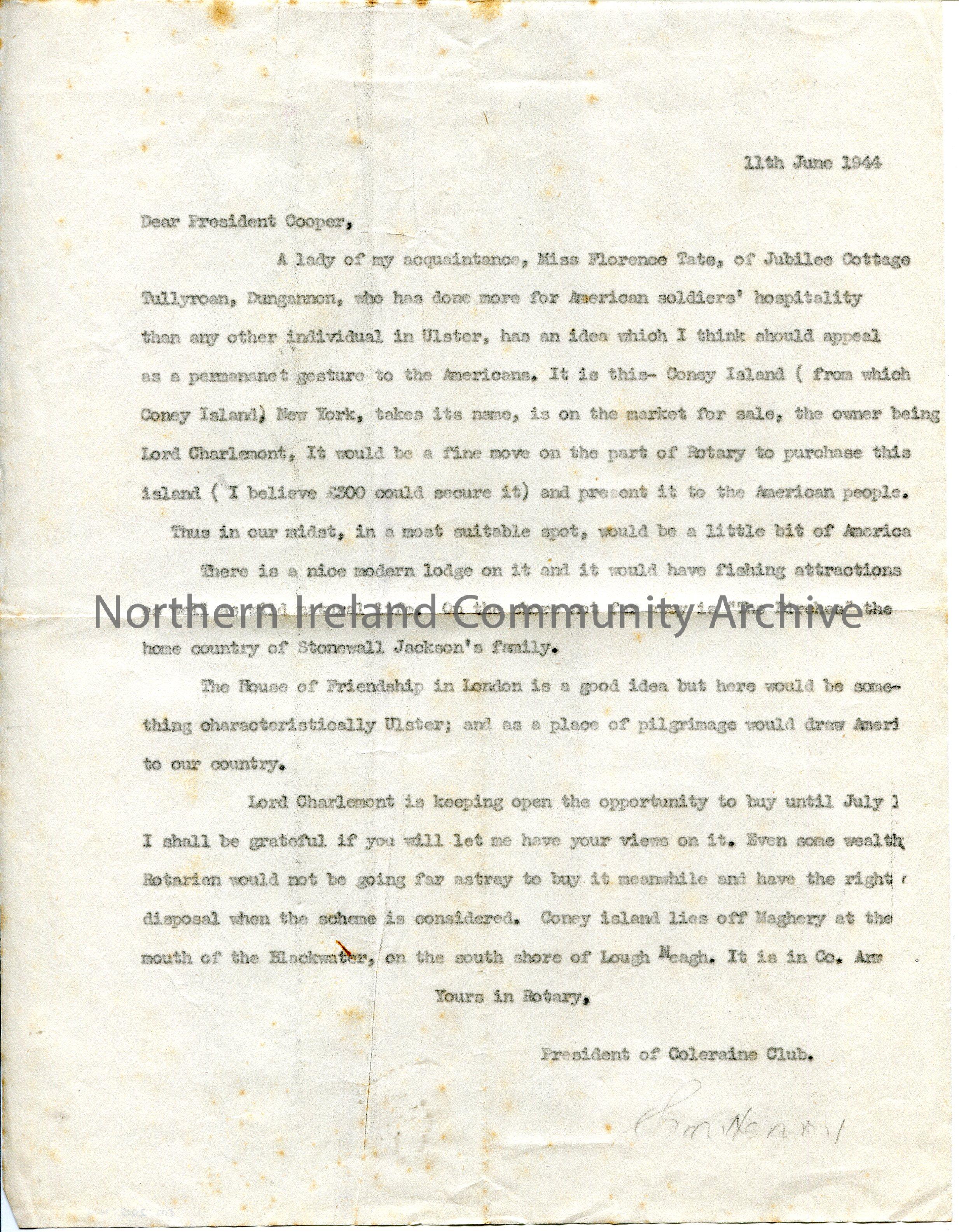 Carbon copy of a typed letter to President Cooper from Sam Henry. Proposes the Rotary Club purchase Coney Island, Lough Neagh, from Lord Charlemont for £300 to present to the American people for their help during World War II.