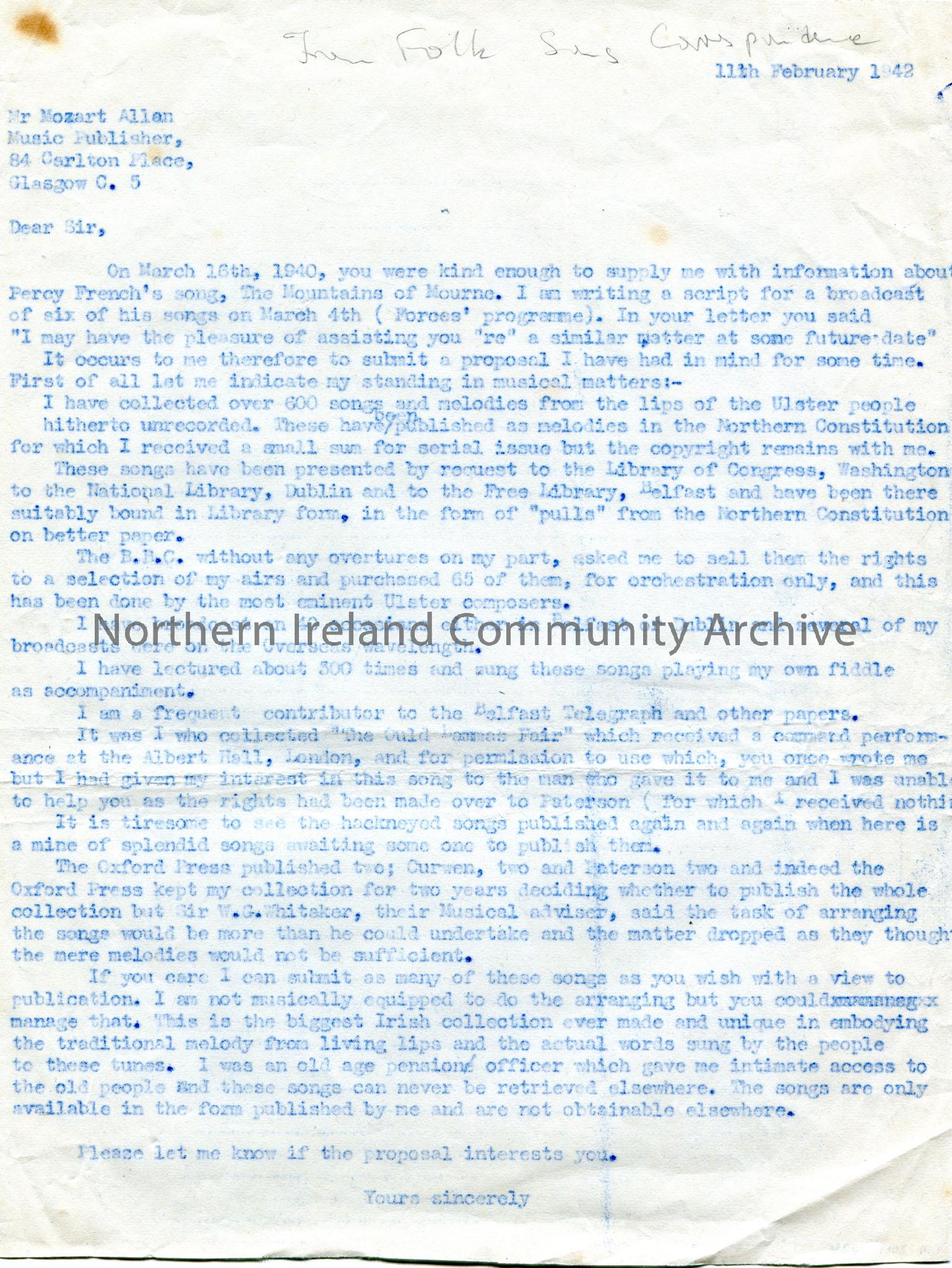 Carbon copy of a typed letter, unsigned, sent to Mr Mozart Allan, Music Publisher, 84 Carlton Place, Glasgow C. 5. 'From Folk Song Correspondence' handwritten in pencil at top of page. Sam writes to convince the recipient to publish his collection of songs. Writing re material for the Percy French 'Forces Programme' of which Sam is writing a script on 6 of French's songs. Writes that his collection of songs have been presented to the libraries in Washington, Dublin and Belfast and the BBC purchased 65 airs for orchestration only. Sam had broadcast on 40 occasions in Belfast and Dublin and overseas wavelength; he had lectured about 300 times-signing the songs and playing the fiddle as accompaniment; contributed to the Belfast Telegraph and other papers. Sam collected 'The Ould Lammas Fair' which was played at the Albert Hall, London.