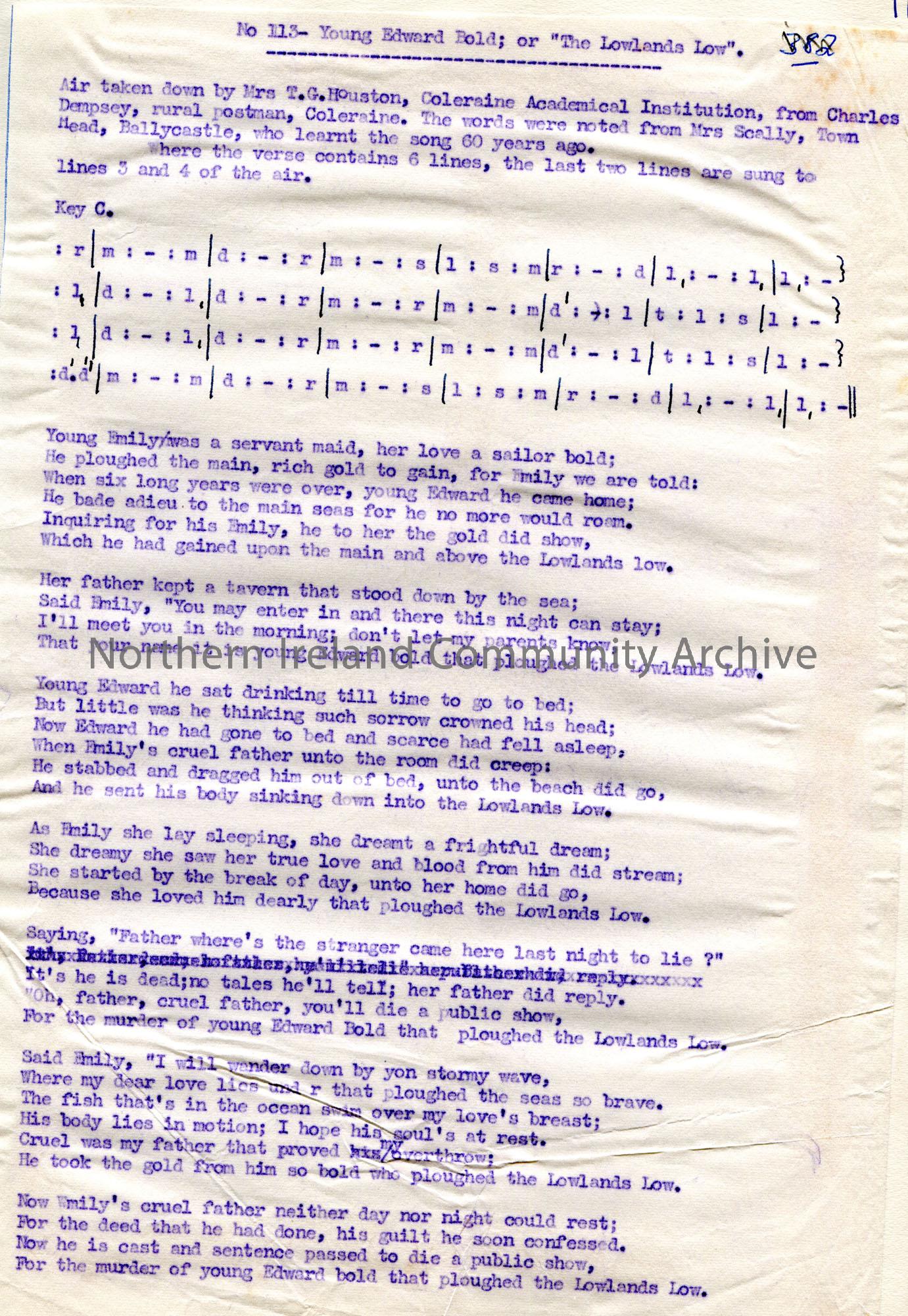 Carbon copy of a typed tonic sol-fa notation and words to song titled, 'No. 113 - Young Edward Bold or The Lowlands Low'. Air taken down by Mrs T. G. Houston, Coleraine from Charles Dempsey, Coleraine. Words noted from Mrs Scally, Ballycastle.