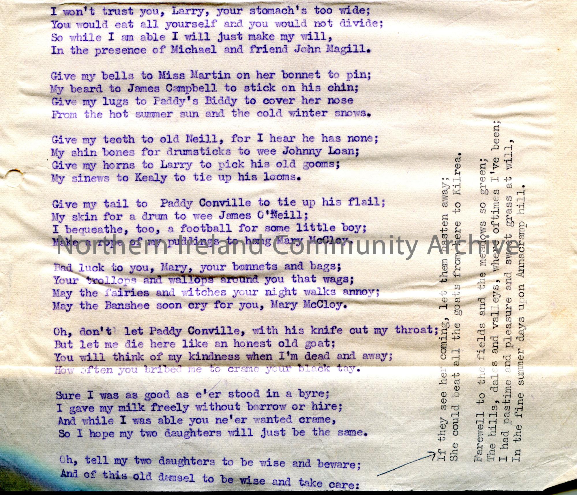 Carbon copy of a typed tonic sol-fa notation and words to song titled, 'No. 119 - The Goat's Will'. From Frank Magill of Mayogall, Knockloughrim...the song was made c1869 by an old mason, Hugh McCann of Culladuff, assisted by others.