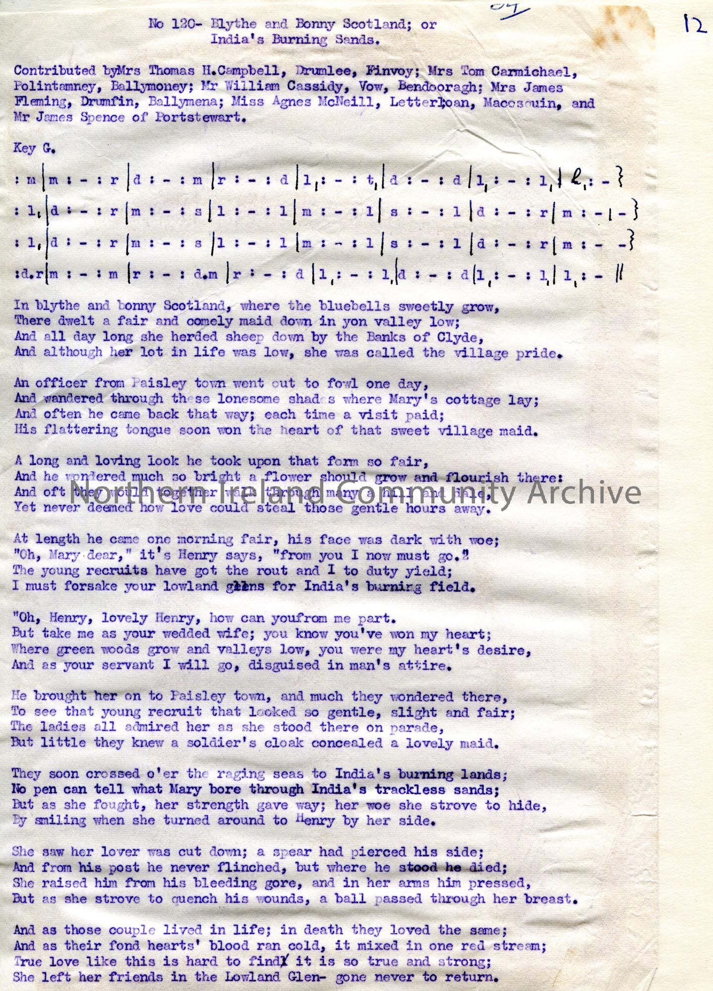 Carbon copy of a typed tonic sol-fa notation and words to song titled, 'No. 120 - Blythe and Bonny Scotland or India's Burning Sands'. Contributed by Mrs Thomas H. Campbell, Drumlee, Finvoy, Mrs Tom Carmichael, Polintamney, Ballymoney, Mr William Cassidy, Vow, Bendooragh, Mrs James Fleming, Drumfin, Ballymena, Miss Agnes McNeill, Letterloan, Macosquin and Mr James Spence, Portstewart.