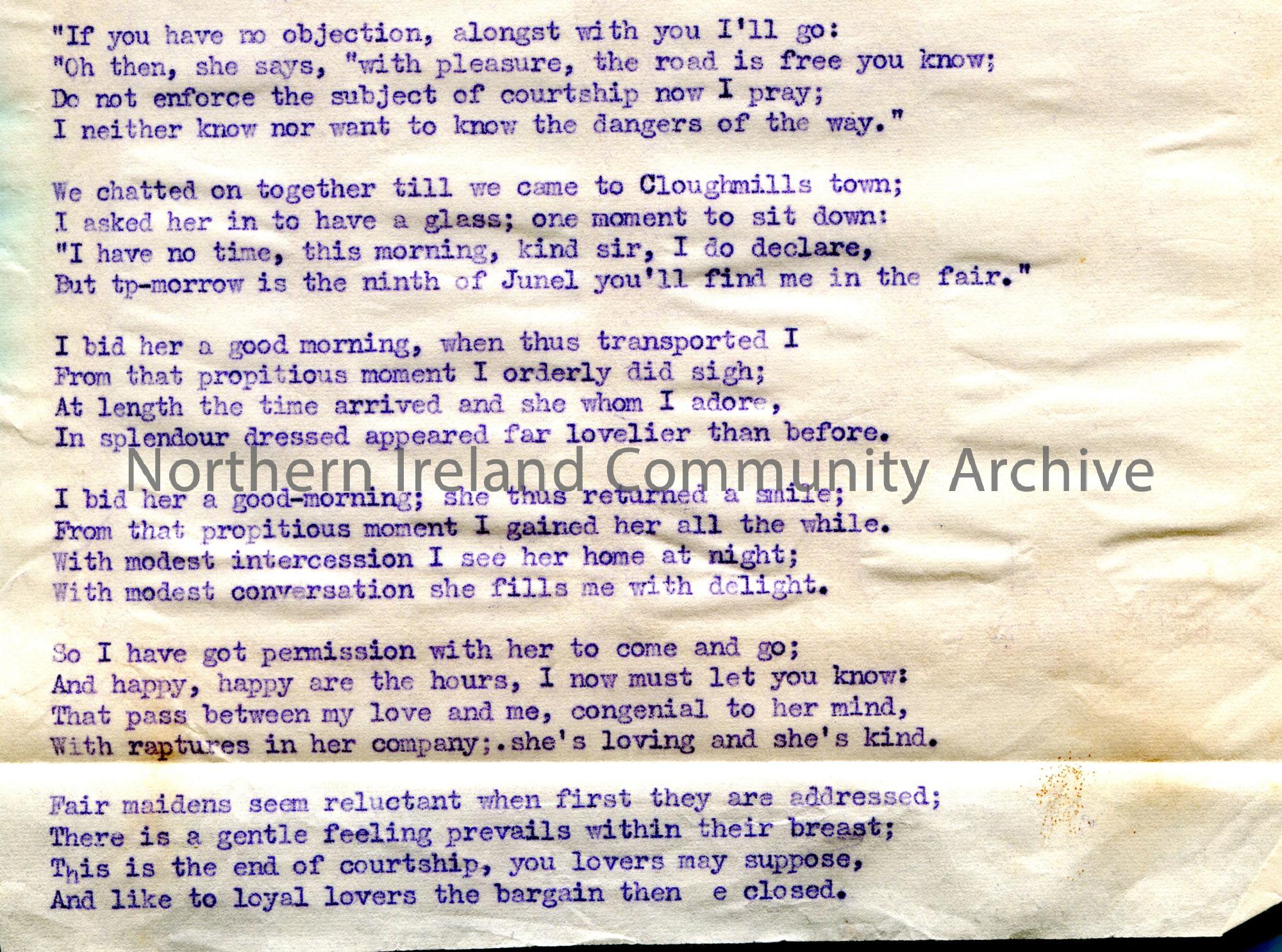 Carbon copy of a typed tonic sol-fa notation and words to song titled, ‘No. 121 – Cloughmills Fair’. Song noted from Mr William Carton, Garryduff, Bal… – Scan037A