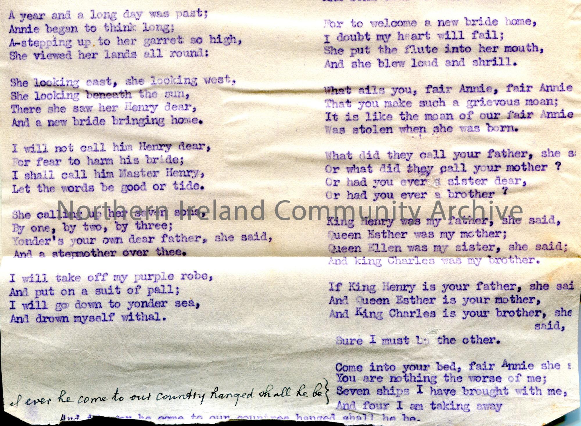 Carbon copy of a typed tonic sol-fa notation and words to song titled, ‘No. 126 – Fair Annie’. Contributed by Eliza Jane Caldwell of Derryard, Dungive… – Scan041A