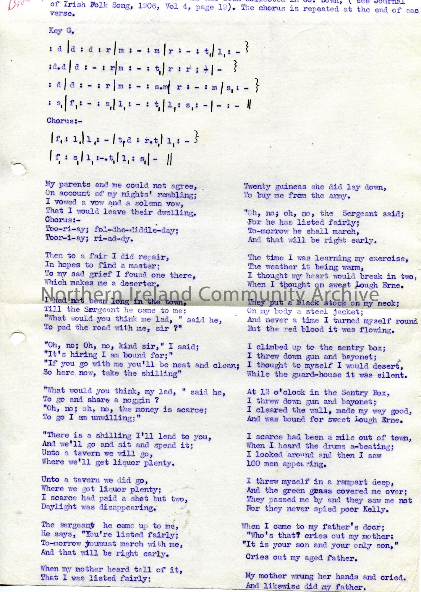 Carbon copy of a typed tonic sol-fa notation and words to song titled, 'No. 223 - The Deserter'. Contributed by Joseph F. McGinnis of New York, who noted the air from his cousin Lawrence McDermott, Brooklyn. Song originally sung by Mr McDermott's grandfather of West Barrs, Co. Leitrim.