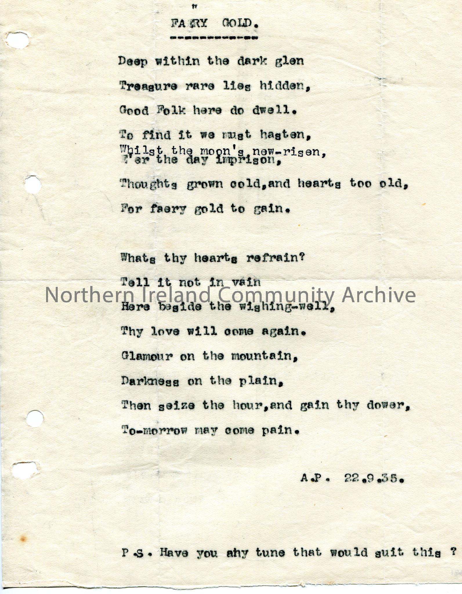 Carbon copy of CM:2017:1680. Typed poem or words to song titled, ‘Faery Gold’. Initialled A.P and dated 22nd September, 1935. ‘P.S. Have you any tune …