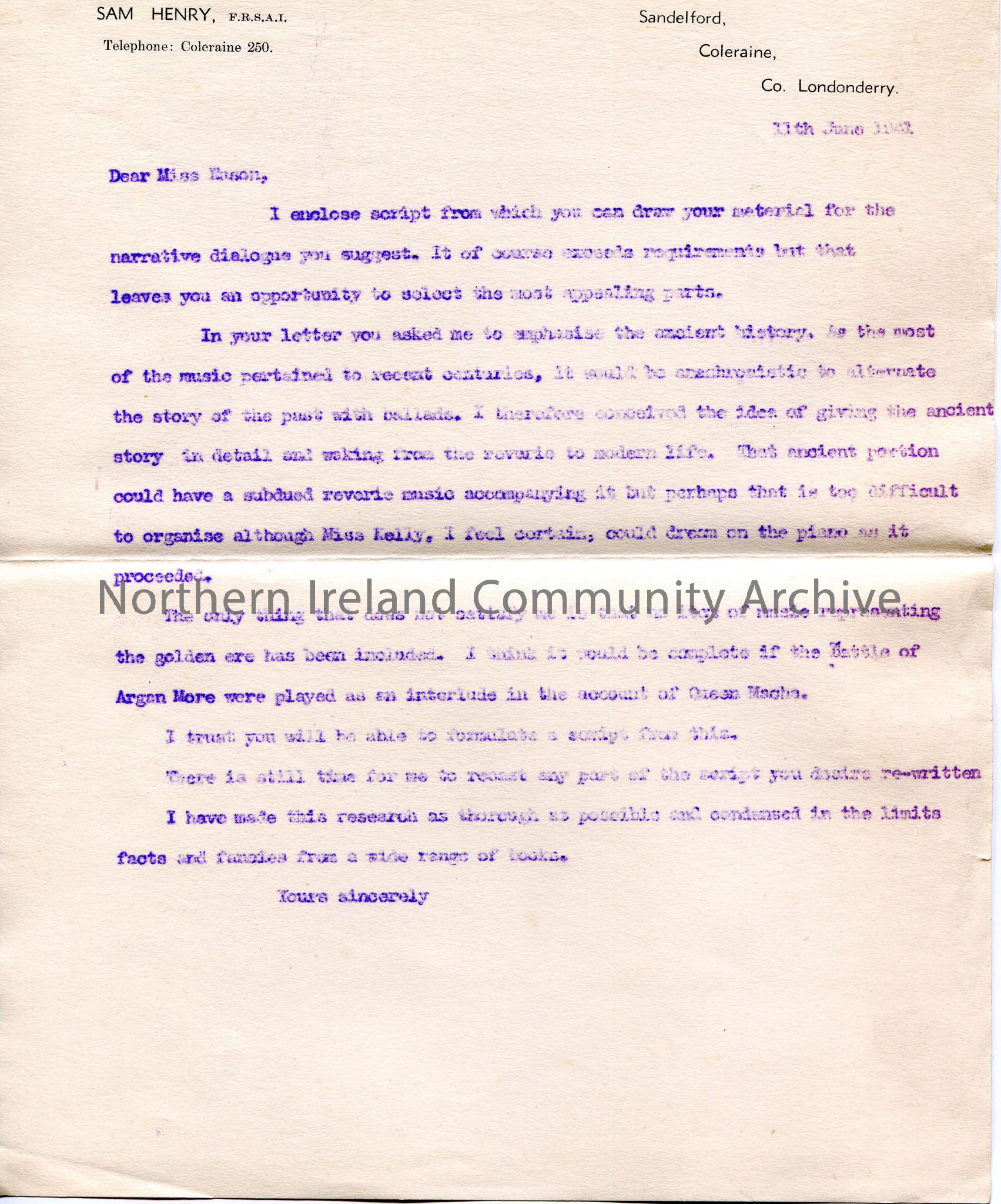 Carbon copy of letter sent to Miss Eason. Writes that he encloses material re Armagh broadcast. He has written it so that the ancient history of the area is mixed with ballads. Wishes the 'Battle of Argan More' be played alongside the account of Queen Macha.