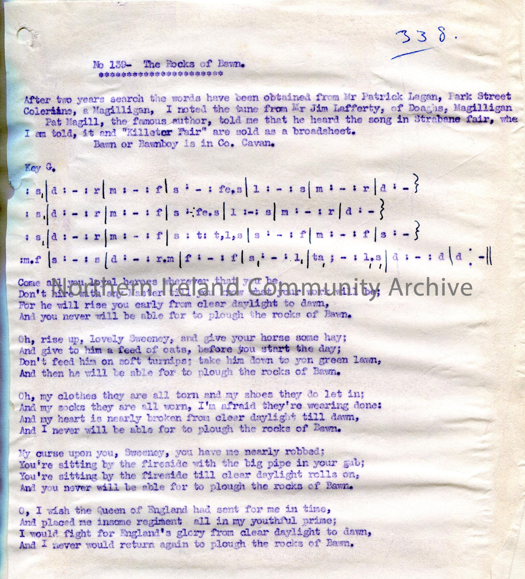 Carbon copy of typed tonic sol-fa notation and words to song titled, 'No. 139 - The Rocks of Bawn'. Words from Patrick Laga, Park Street, Coleraine, a Magilligan. Tune noted from Jim Lafferty, of Doagh, Magilligan. Pat Magill heard the song at Strabane fair.