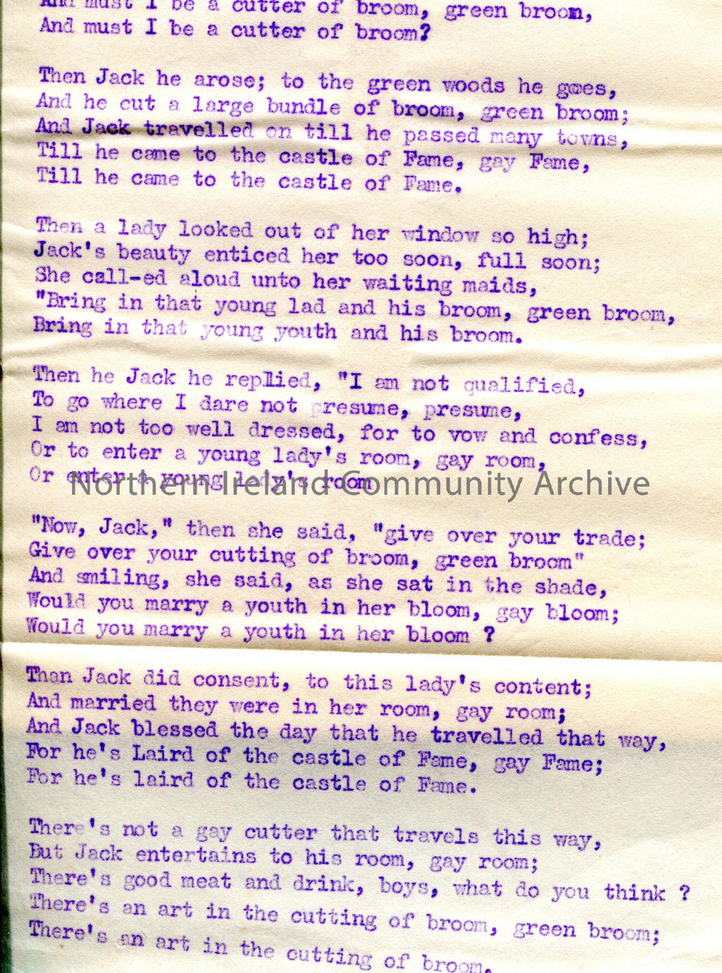 Carbon copy of typed tonic sol-fa notation and words to song titled, 'No. 147 - The Green Broom'. Noted from Mr William Davidson, Drumnakeel, Ballyvoy, Ballycastle. A variant of this song has been collected in Somersetshire by Cecil Sharp.