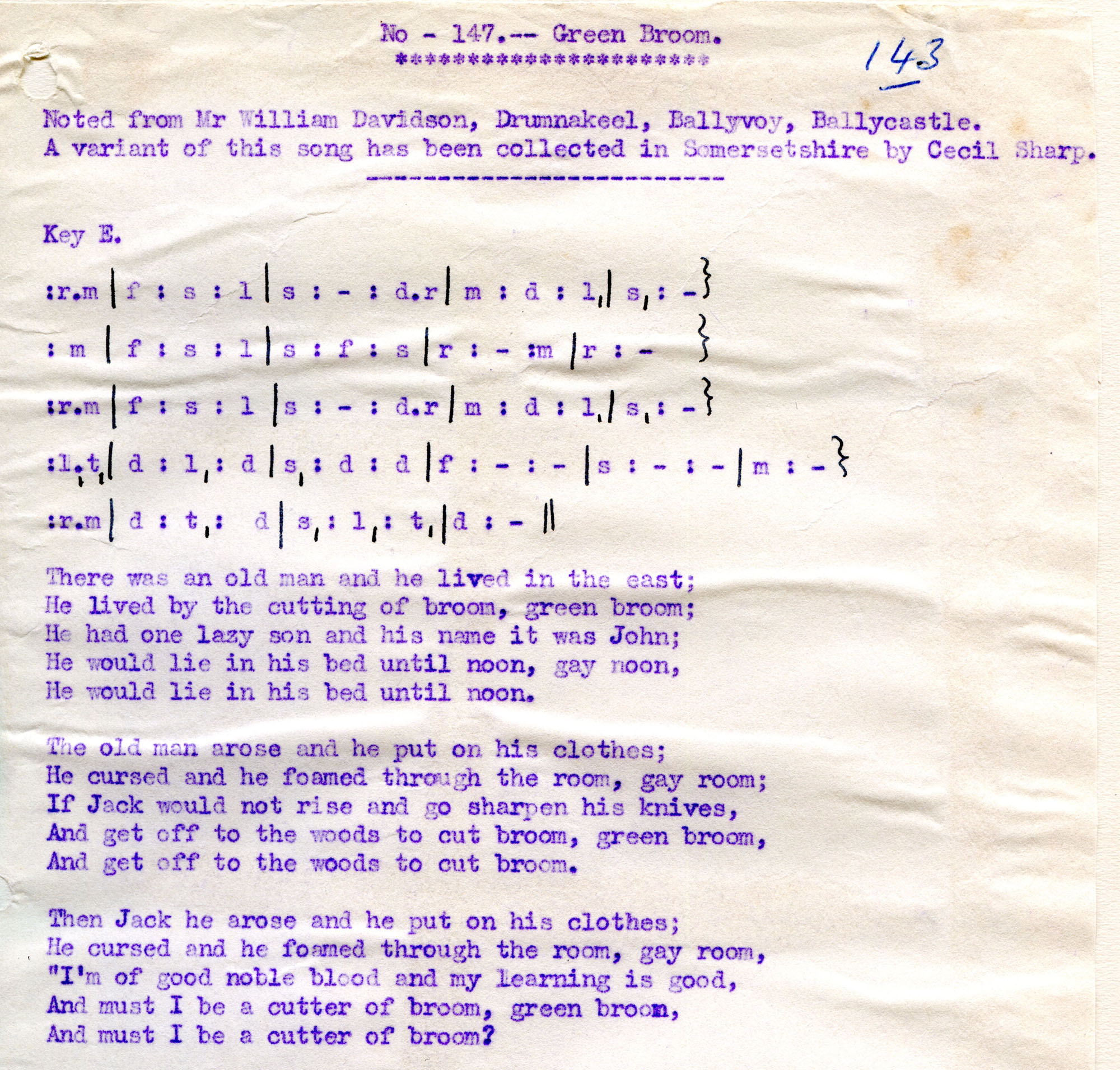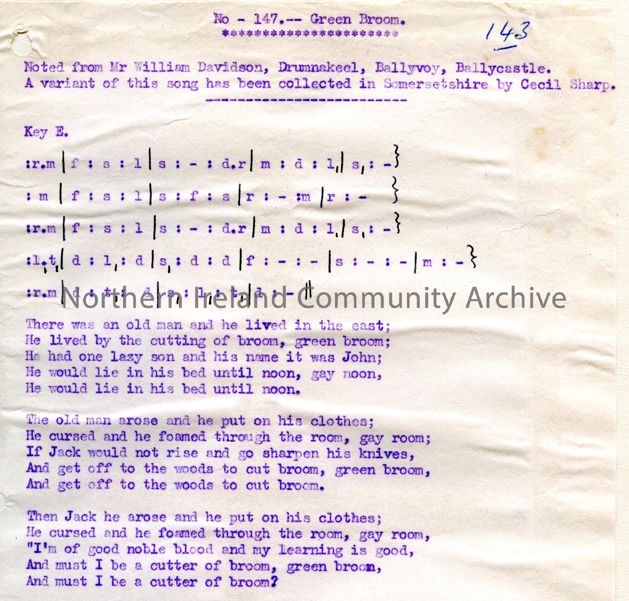 Carbon copy of typed tonic sol-fa notation and words to song titled, 'No. 147 - The Green Broom'. Noted from Mr William Davidson, Drumnakeel, Ballyvoy, Ballycastle. A variant of this song has been collected in Somersetshire by Cecil Sharp.