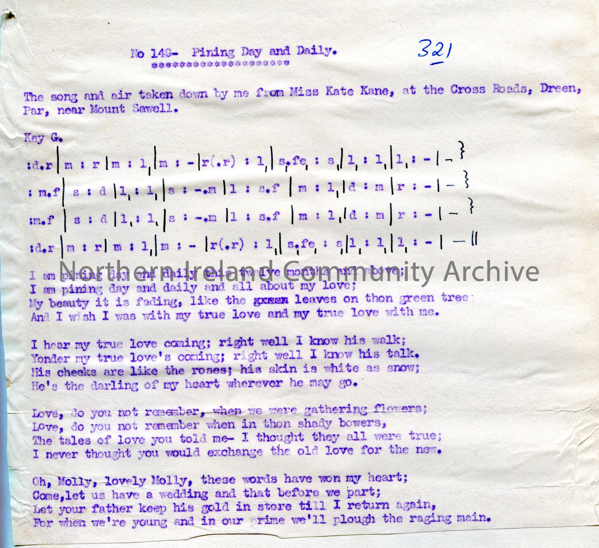 Carbon copy of typed tonic sol-fa notation and words to song titled, 'No. 149 - Pining Day and Daily'. Song and air taken down by Sam Henry from Miss Kate Kane, at the Cross Roads, Dreen, Par, near Mount Sawell.