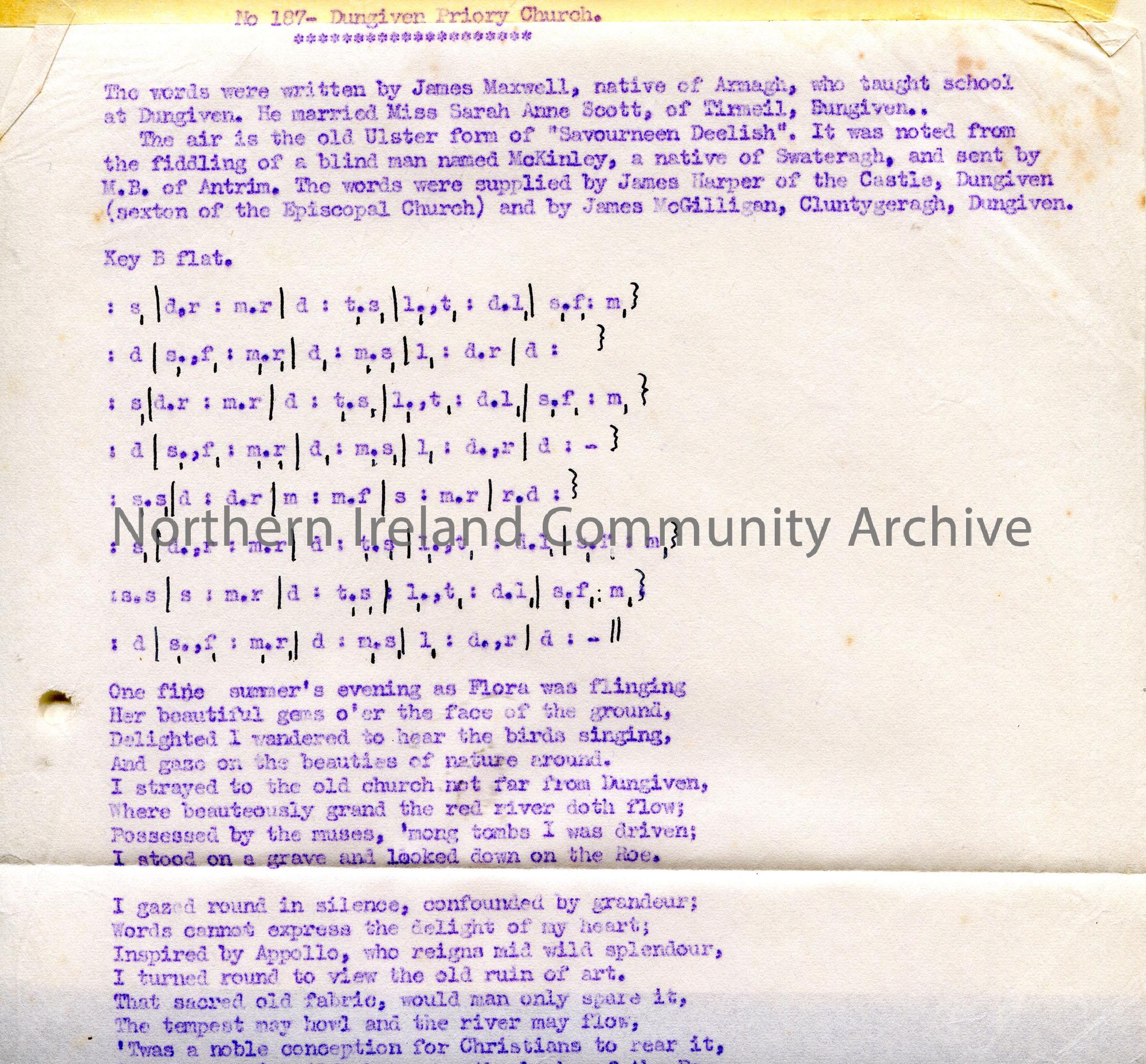 Carbon copy of typed tonic sol-fa notation and words to song titled, ‘No. 187 – Dungiven Priory Church’.