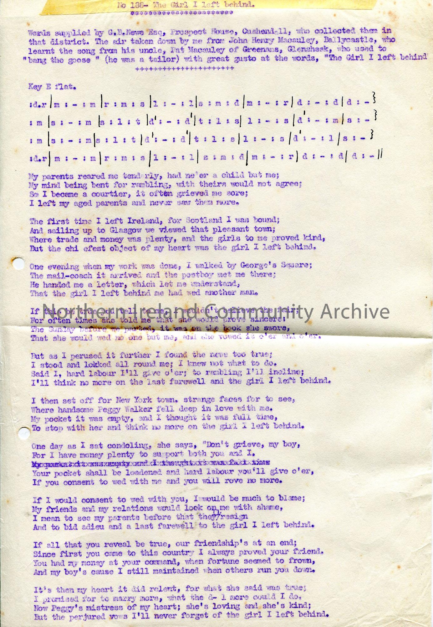 Carbon copy of typed tonic sol-fa notation and words to song titled, ‘No. 188 – The Girl I Left Behind’. Words supplied by G. B. Newe, Cushendall, who…