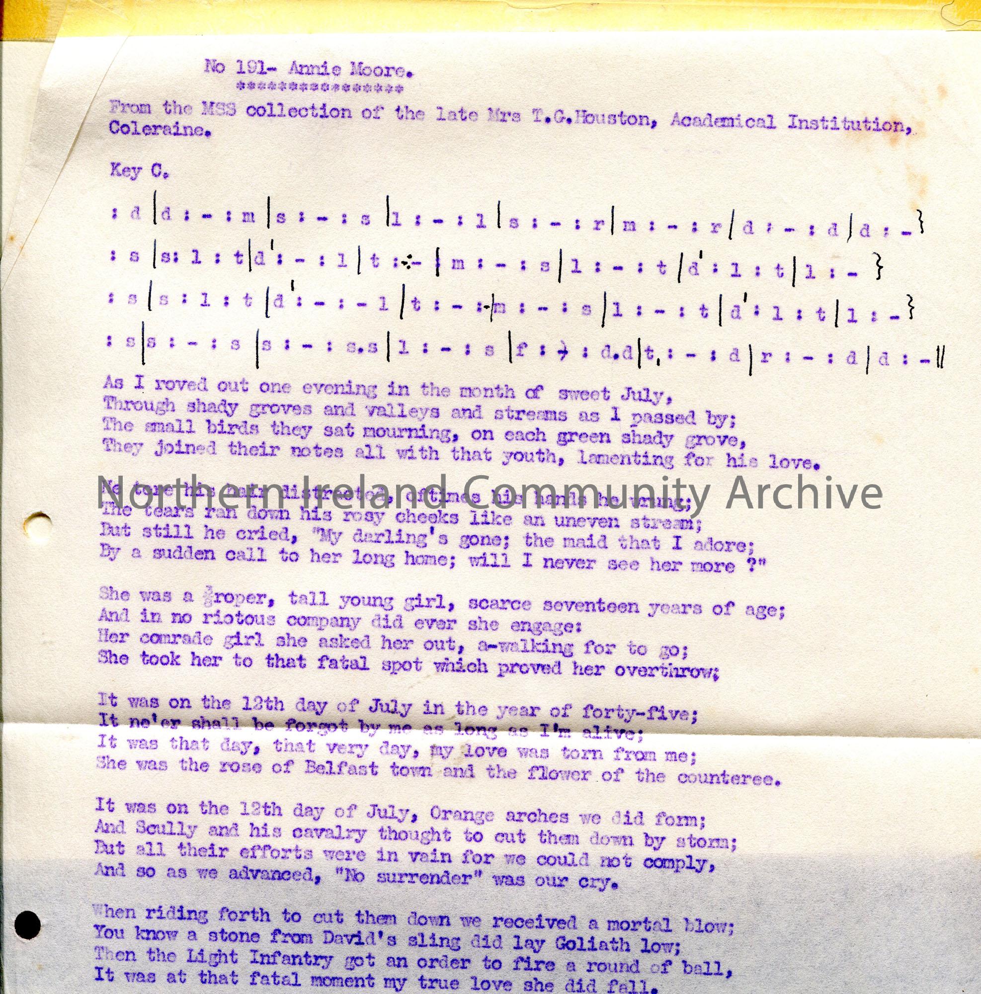 Carbon copy of typed tonic sol-fa notation and words to song titled, 'No. 191 - Annie Moore'. From the MSS collection of the late Mrs T. G. Houston, Academical Institution, Coleraine.