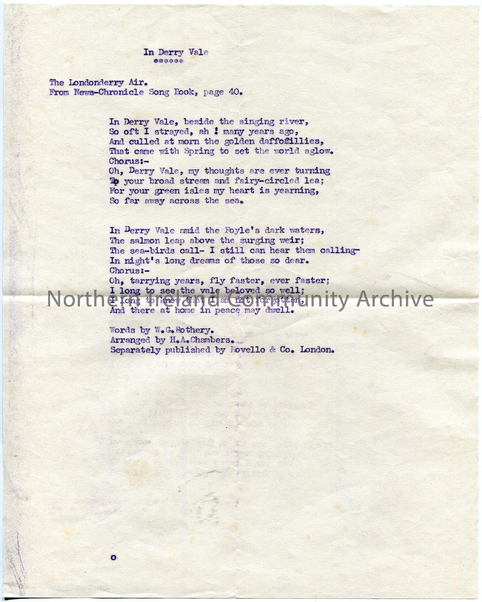 Carbon copy of typed words to song, 'In Derry Vale'. The Londonderry Air. From News - Chronicle Song Book, page 40. Words by W.G. Rothery. Arranged by H.A. Chambers. Separately published by Novello & Co. London.