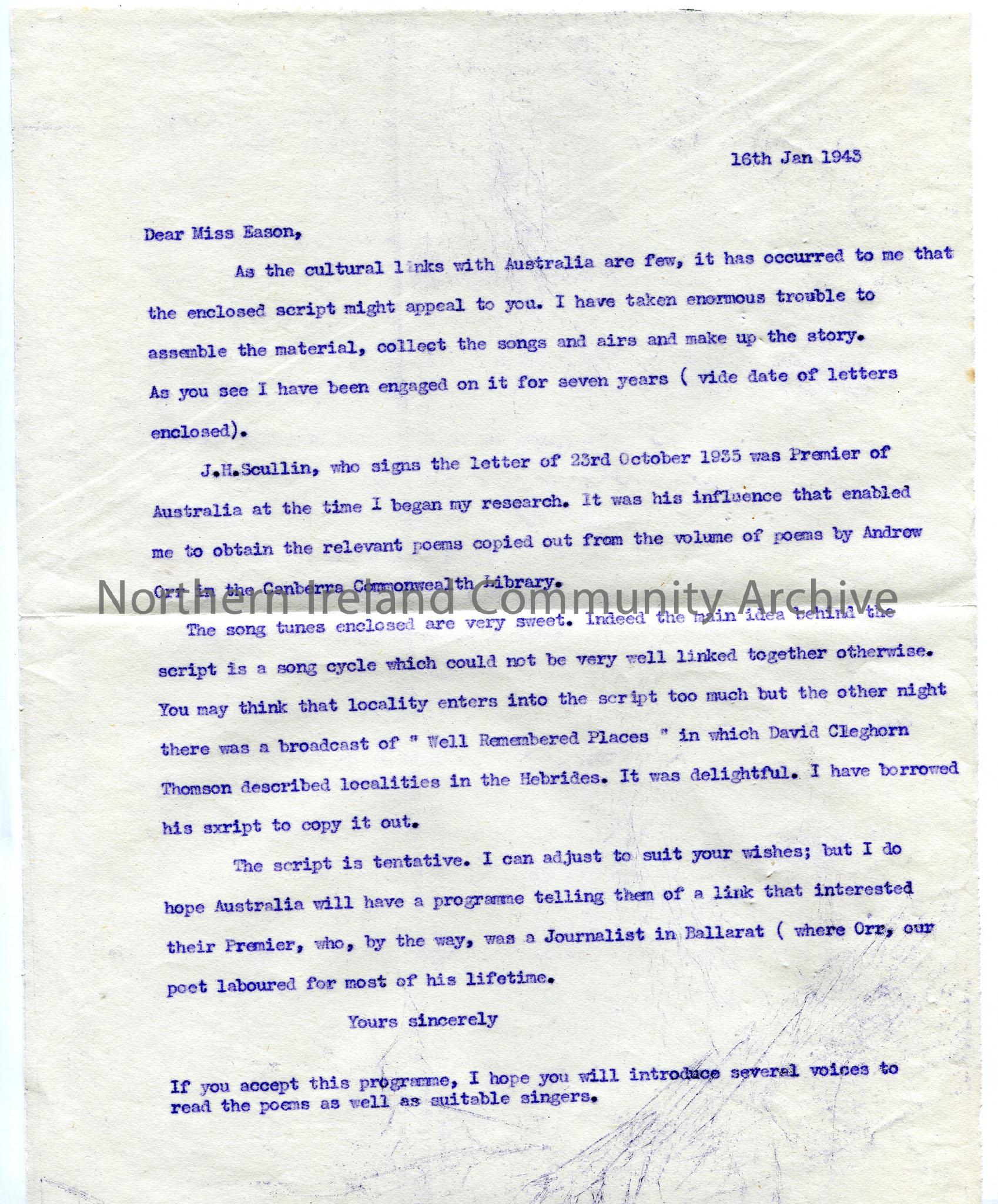 Carbon unsigned copy of typed letter to 'Miss Eason' from Sam Henry, about an enclosed script on Andrew Orr, hoping that she will broadcast it. [In the refusal letter CM:2014:128 she signs herself as Ursula']. Mentions research carried out and other Australians corresponded with, including J H Scullion , the Premier.