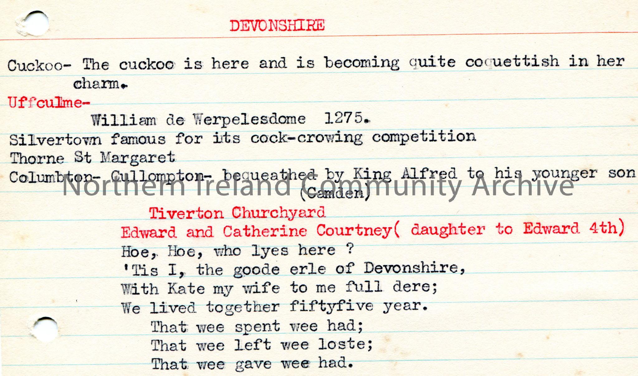 Card 1 of 2. Typed notes on lined card titled, 'Devonshire'. Mentions William de Werpelesdome, 1275, Silvertown, Tiverton Churchyard, Edward and Catherine Courtney. Includes folk rhymes of Devon by William Crossing.