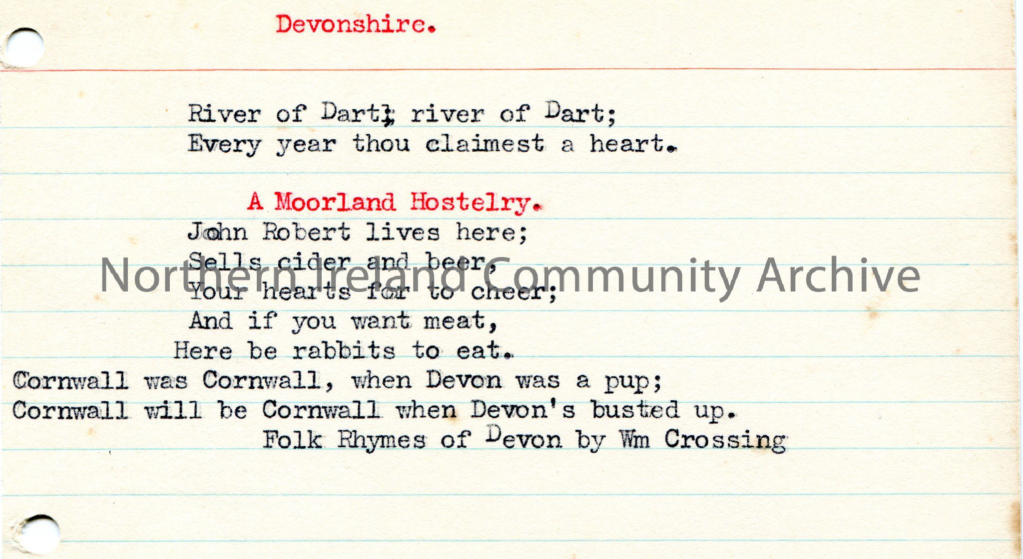 Card 2 of 2. Typed notes on lined card titled, 'Devonshire'. Mentions William de Werpelesdome, 1275, Silvertown, Tiverton Churchyard, Edward and Catherine Courtney. Includes folk rhymes of Devon by William Crossing.