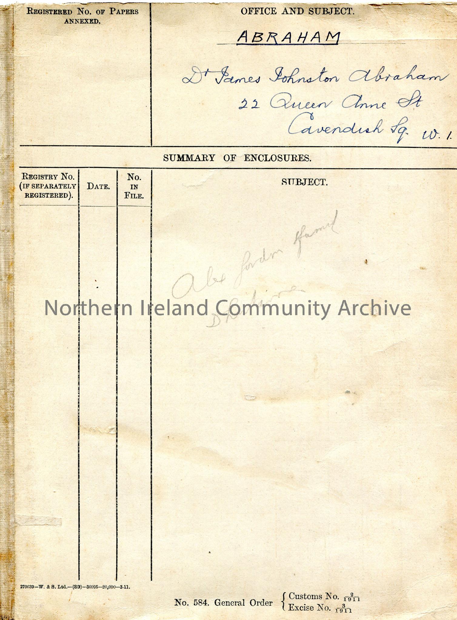 Card folder, front and back cover held together with gauze type material, with ‘Abraham, Dr James Johnston Abraham, 22 Queen Anne St, Cavendish Sq, W….