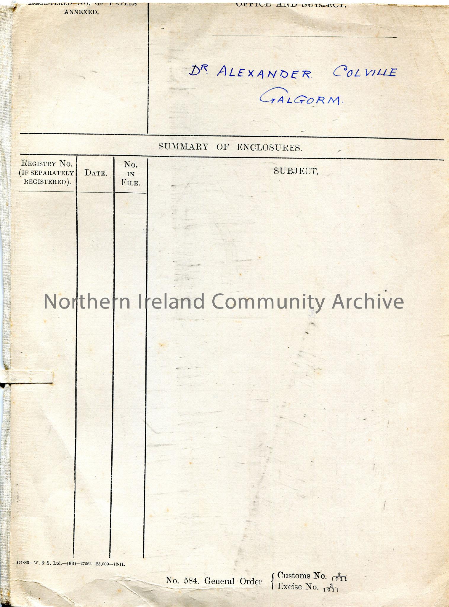 Card folder with fabric spine. Customs and excise folder with ‘Dr Alexander Colville Galgorm’, handwritten on front.