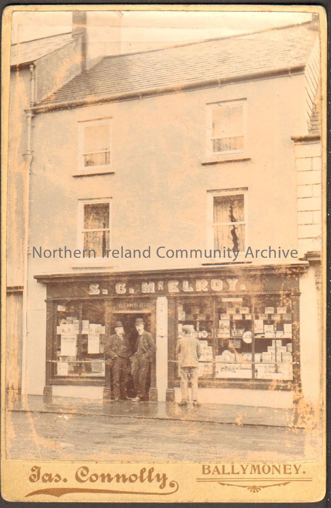 Card mounted sepia photograph of S. G. McElroy (shop) with two smartly dressed men in the doorway and another man looking at the window.