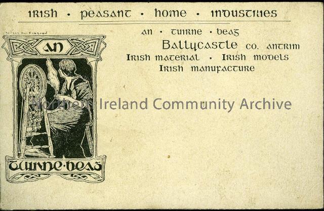 Advertising Card. Possibly part of IHIS 197- Booklets and Notes about Irish Home Industries Shop and allied matters. This card is a B/W advertising card for Irish Home Industries (An Tuirne Beag), Ballycastle. Courtesy of Ballycastle Museum.
