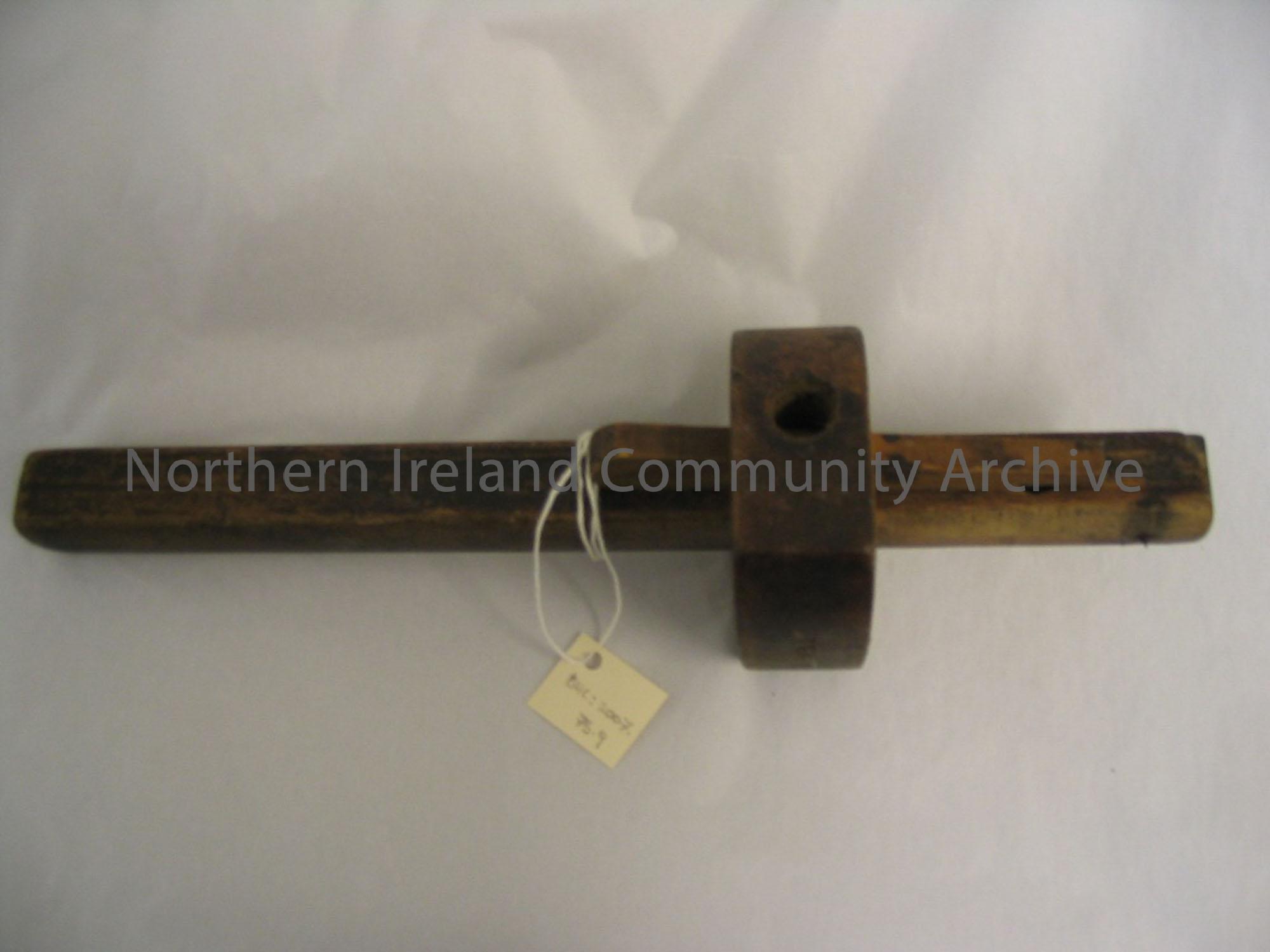 carpentry tool dating from early 20th century. Wooden implement with small nail at one end. Used for measuring and marking wood. Inscribed with the na…