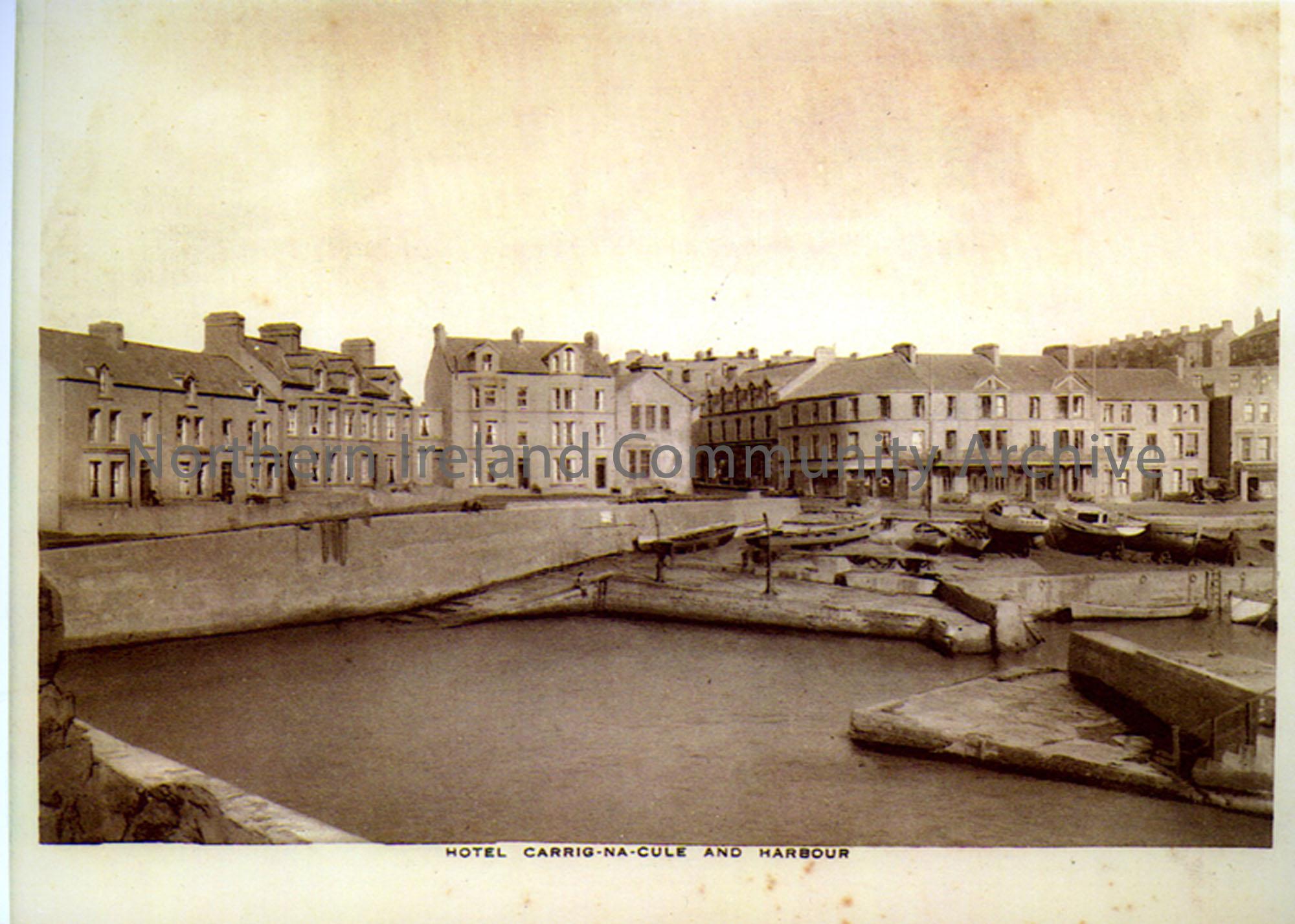Black and white photograph of Carrig-Na-Cule Hotel and Portstewart harbour.