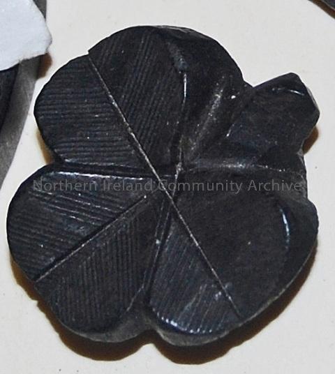 Bog Oak Carvings - One of ten tiny Bog Oak carvings. This one is a small shamrock with some surface detail. Courtesy of Ballycastle Museum.