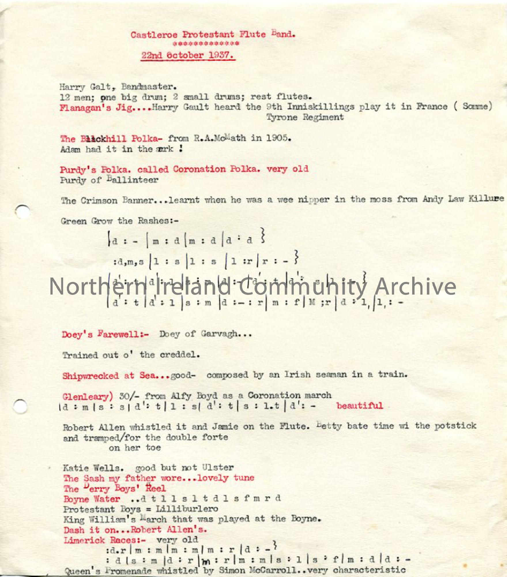Castleroe Protestant Flute Band, 22nd October 1937. Typed words and tonic sol-fa notation to verses, along with brief notes re: Castleroe band members and other tunes.
