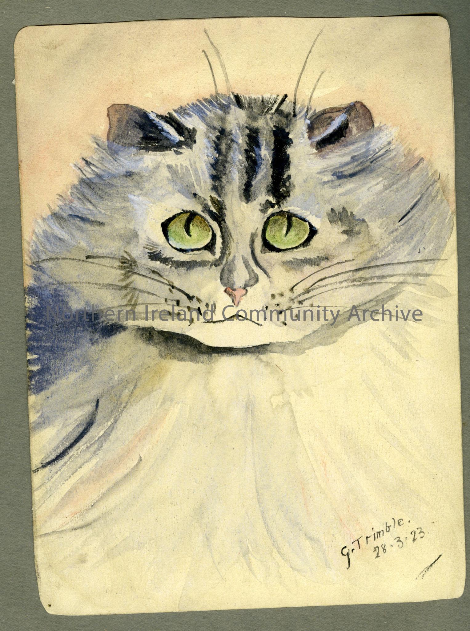 small portait watercolour depicting a grey cat with green eyes. Signed G.Trimble and dated 28th March 1923.