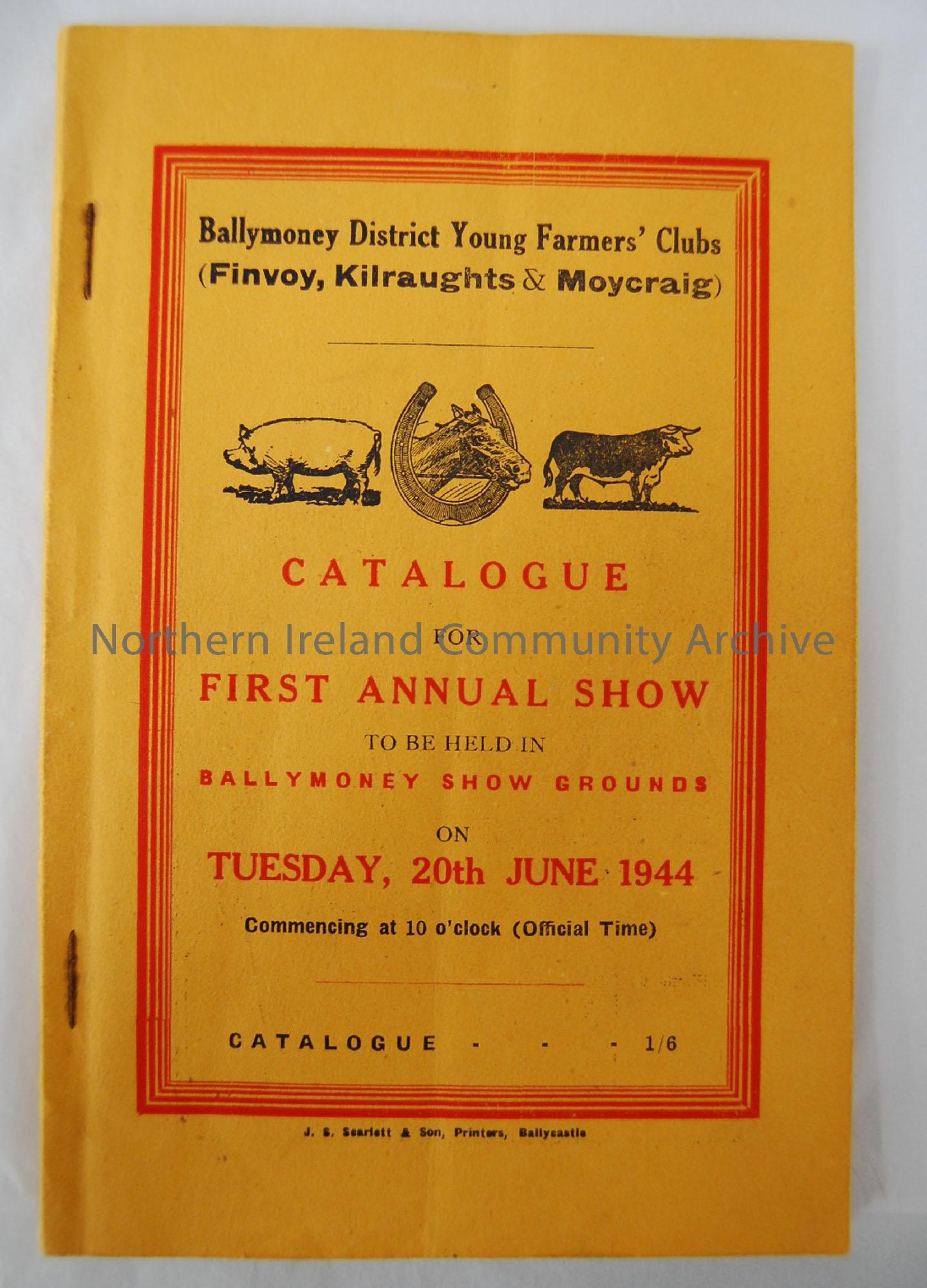 Catalogue for 1944 show. 'Ballymoney District Young Farmers' Clubs (Finvoy, Kilraughts & Moycraig) Catalogue for the first Annual Show to be held in Ballymoney Show Grounds on Tuesday 20th June 1944'