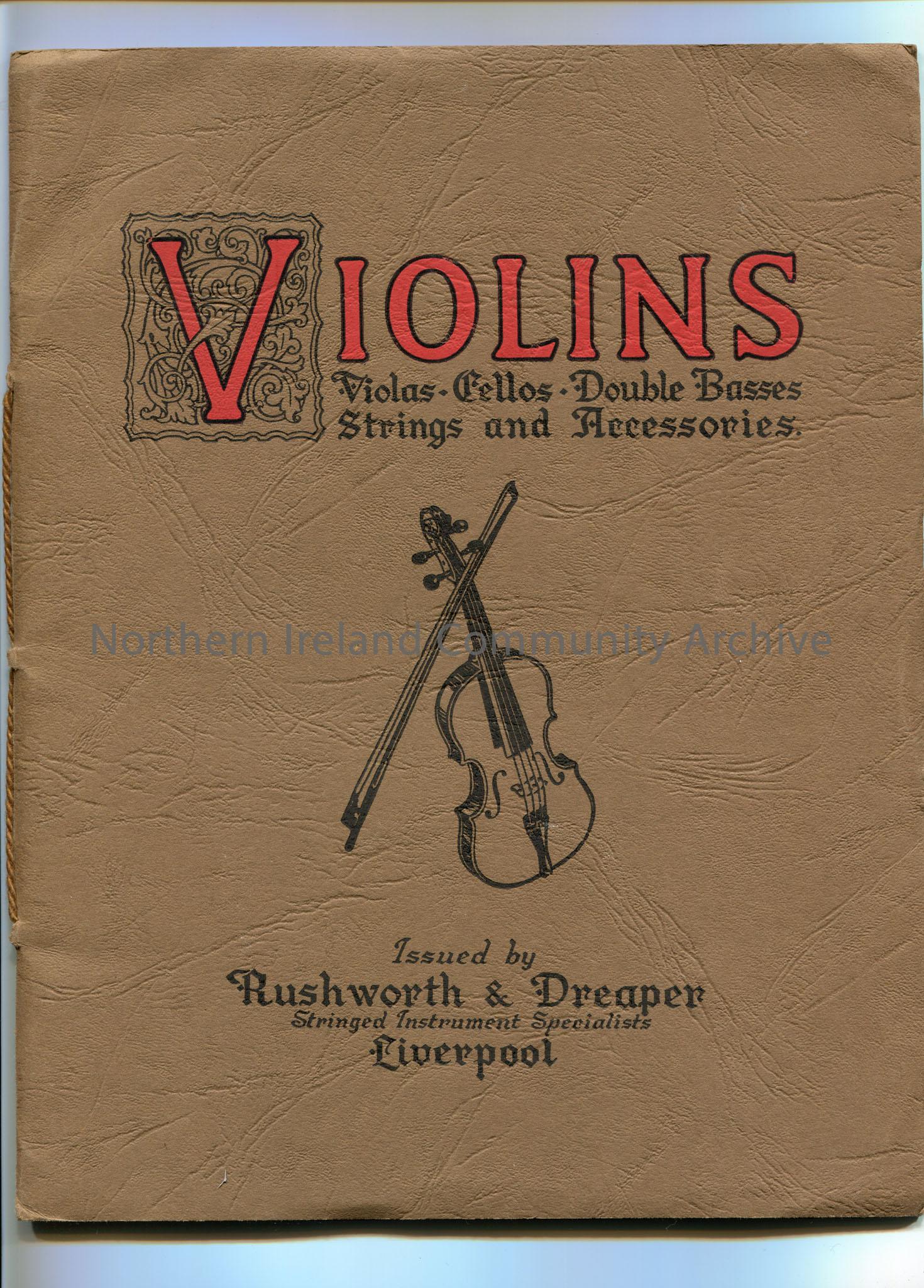 Catalogue titled, ‘Violins, Violas, Cellos, Double Basses, Strings and Accessories’. Brown cover. Issued by Rushworth & Dreaper, Stringed Instrument S…