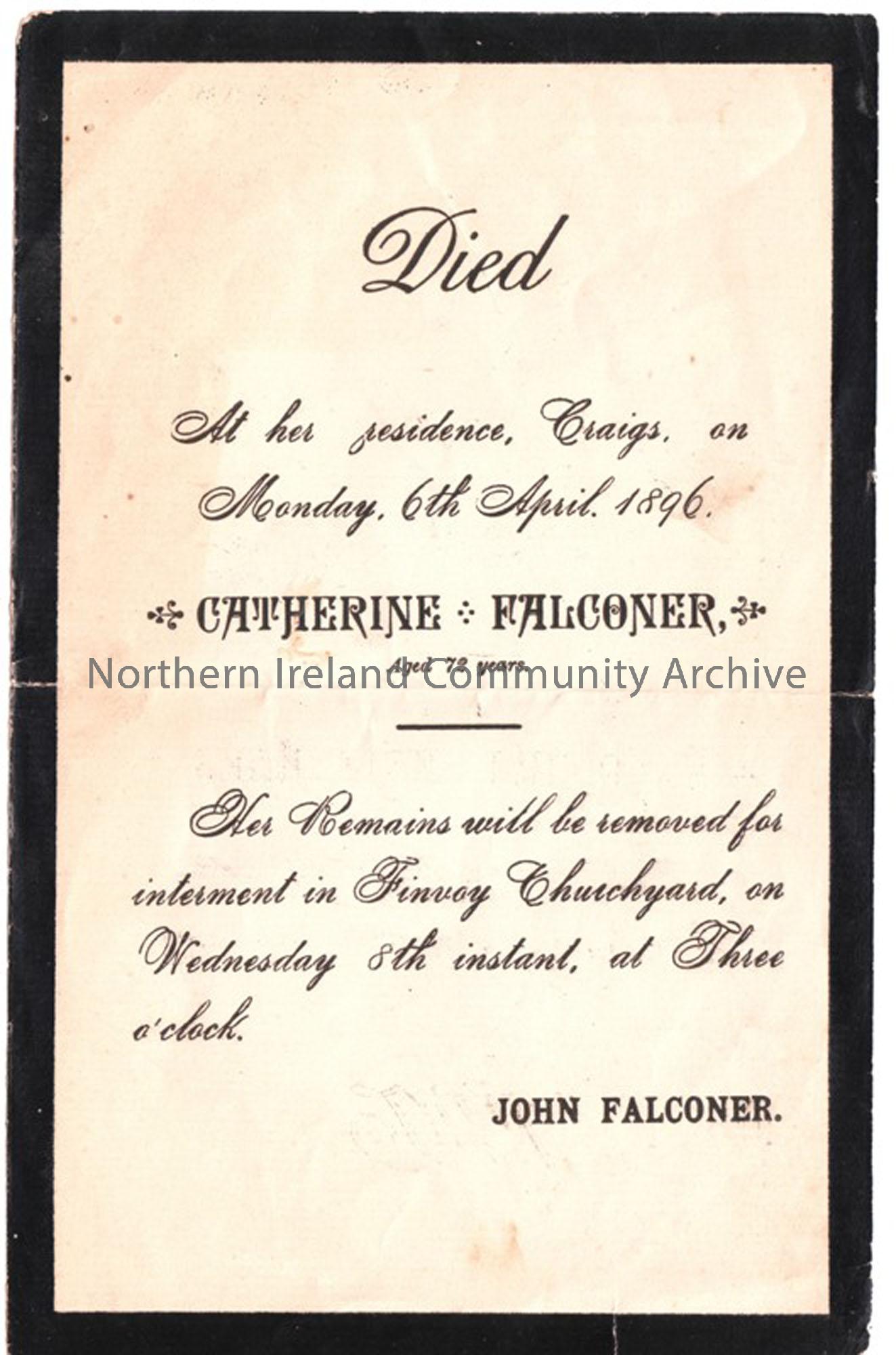 Catherine Falconer of Craigs, buried in Finvoy Churchyard d. 6th April 1896, 72 years