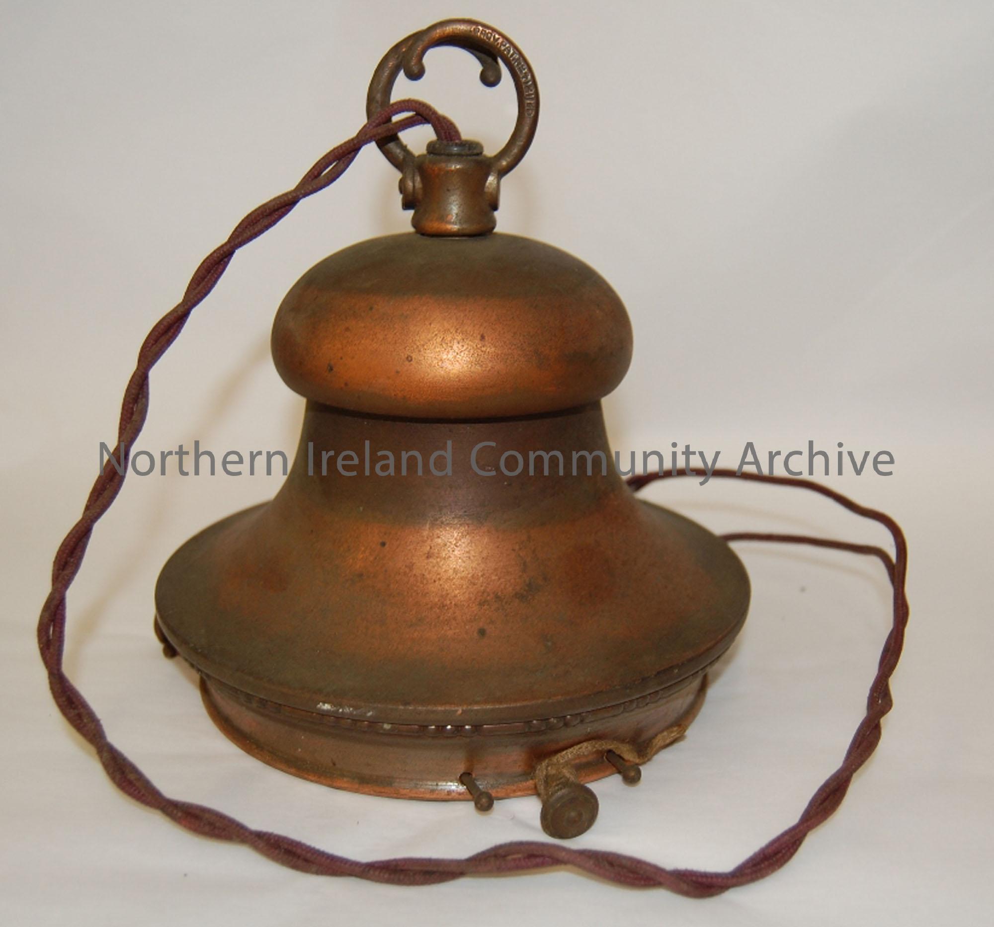 Ceiling lamp, copper shade and fitting for electrical light. Glass cover missing.