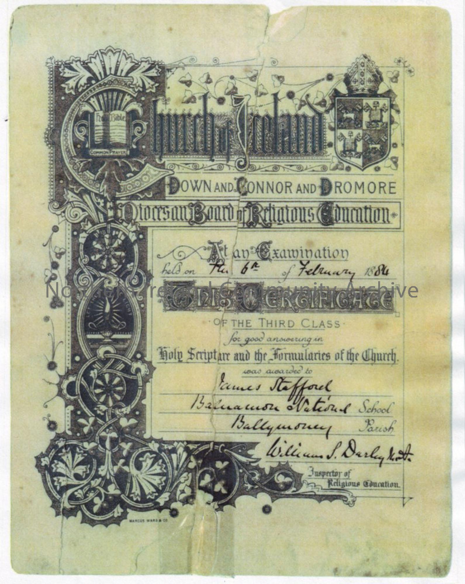 certificate awarded by the Church of Ireland to James Stafford of Balnamore National School for an exam in Holy Scripture and Formularies of the churc…