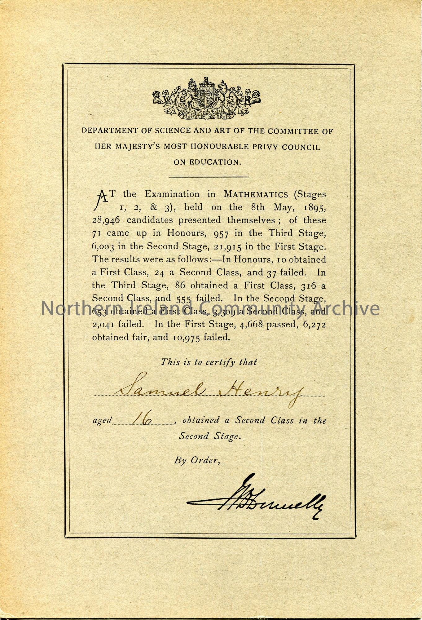 Certificate awarded to Samuel Henry, aged 16, for obtaining a Second Class in the Second Stage of Mathematics examinations on 8th May, 1895. Printed signature of ? Donnelly ?