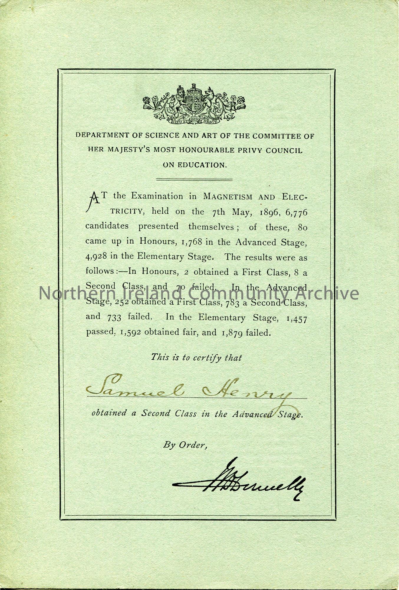 Certificate awarded to Samuel Henry for obtaining a Second Class in the Advanced Stage of Magnetism and Electricity examinations on 7th May, 1896. Printed signature of ? Donnelly ?