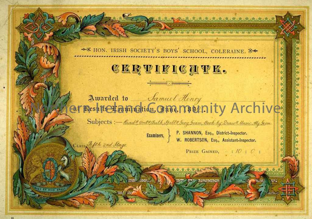 Certificate from the Hon. Irish Society’s Boys’ School 1890