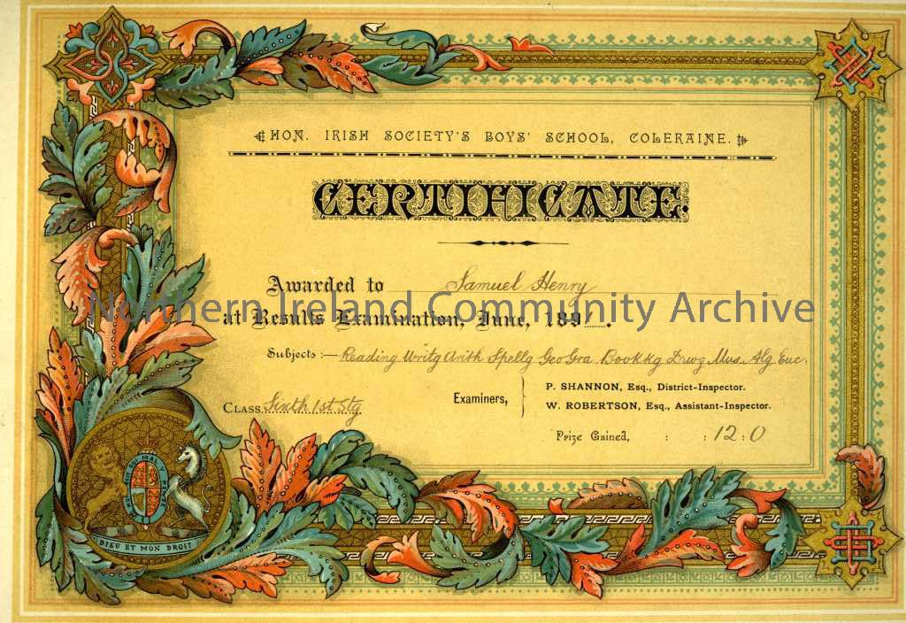 Certificate from the Hon. Irish Society’s Boys’ School 1891