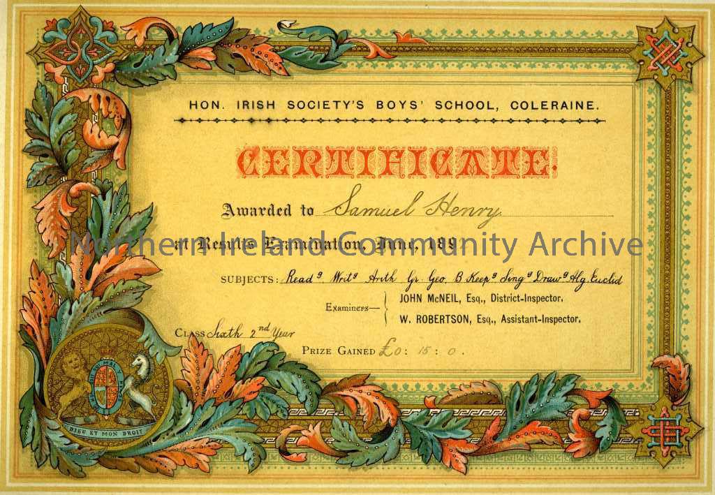 Certificate from the Hon. Irish Society’s Boys’ School 1892