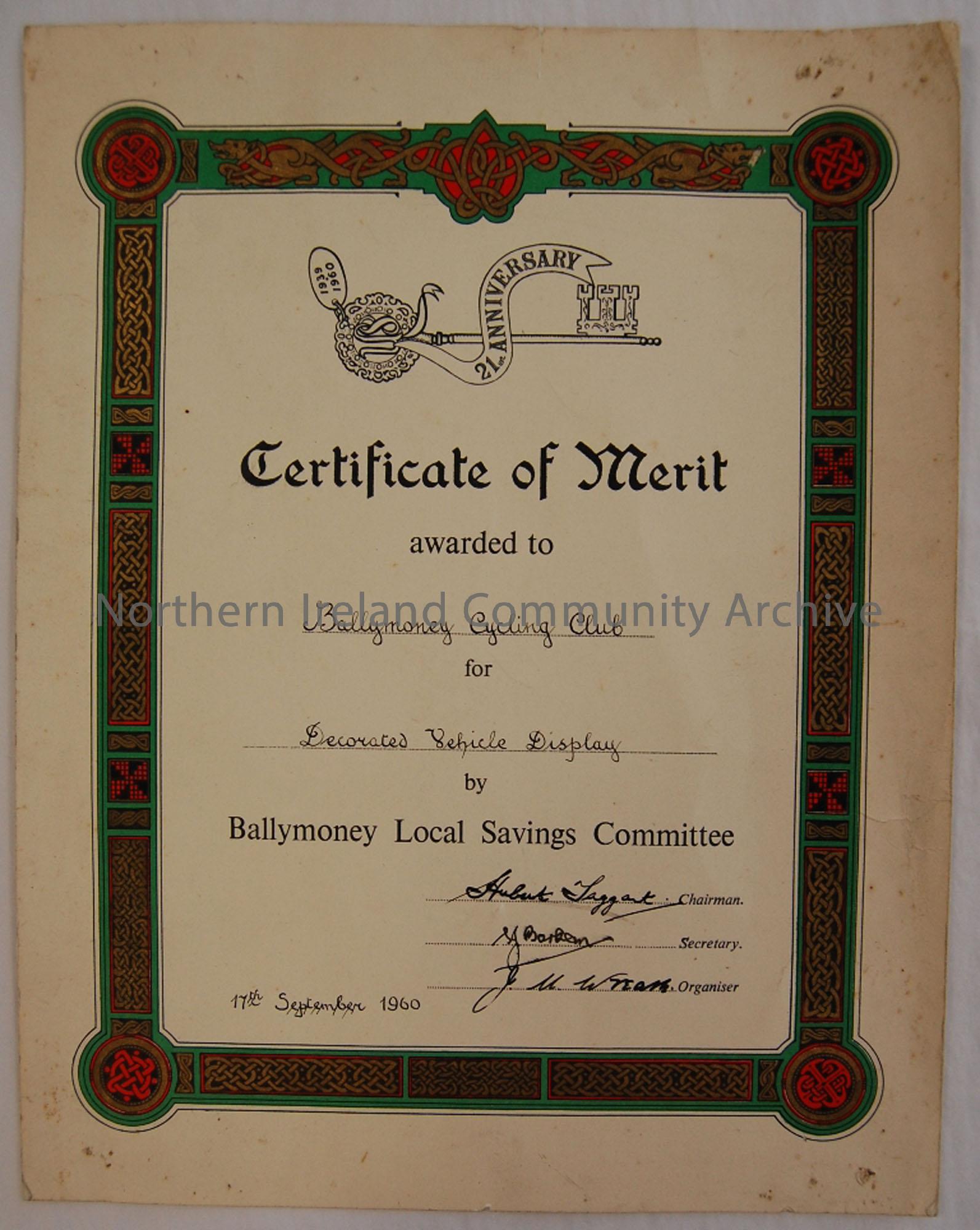Certificate of Merit awarded to B Cycling Club for Decorated Vehicle Display by Ballymoney Local Savings Committee.