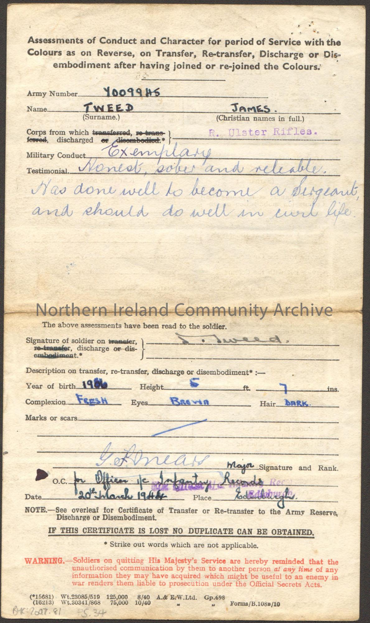 Certificate of Transfer or Re-transfer to the Army Reserve, Discharge or Disembodiment for James Tweed. White paper form filled in with black handwrit…